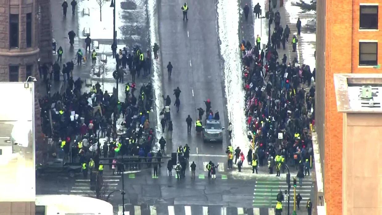 美国明尼苏达州明尼阿波利斯市市政厅外的人群以及航拍画面。图片来源:美国哥伦比亚广播公司新闻。