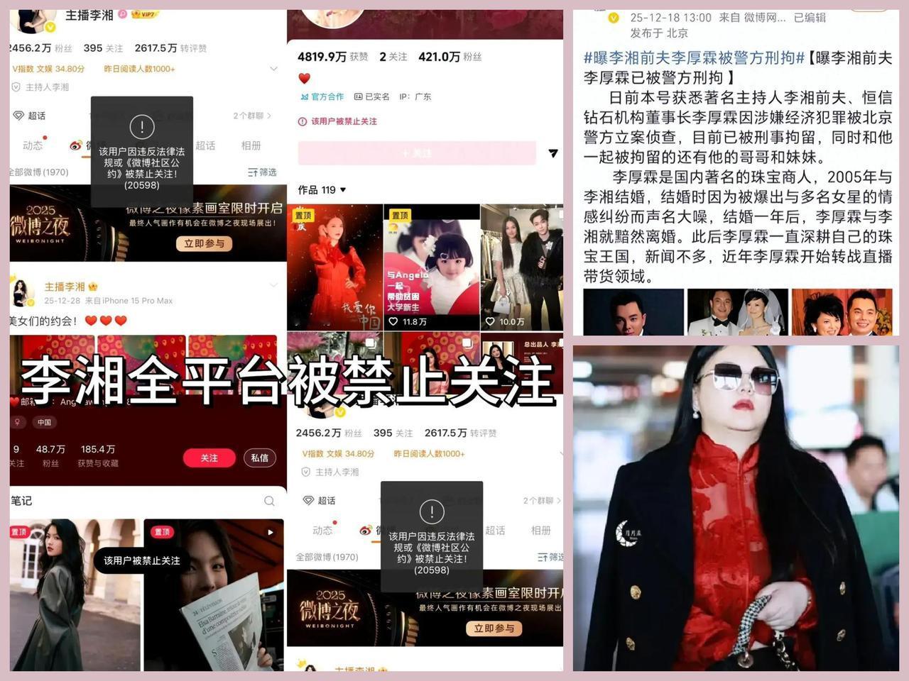 这闫学晶刚消停了没几天,李湘也出问题了。 多个平台直接把她的账号给下线了,官方只通知她触犯社区公约。 工商记录扒出她名下10余家公司状态异常,前夫赶在年底前十几天被刑拘,她本人却在英国继续晒着豪宅名表。 人们追问着她的跨境资产具体来源,有人翻出她注册资本300万的记录,还有一次性投资1500万的传闻。 在国内挣钱就该想着怎么为国家做贡献,把钱弄出去逍遥就得承担风险,这种制裁一点都不冤枉。