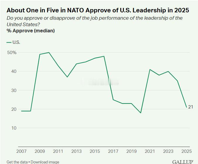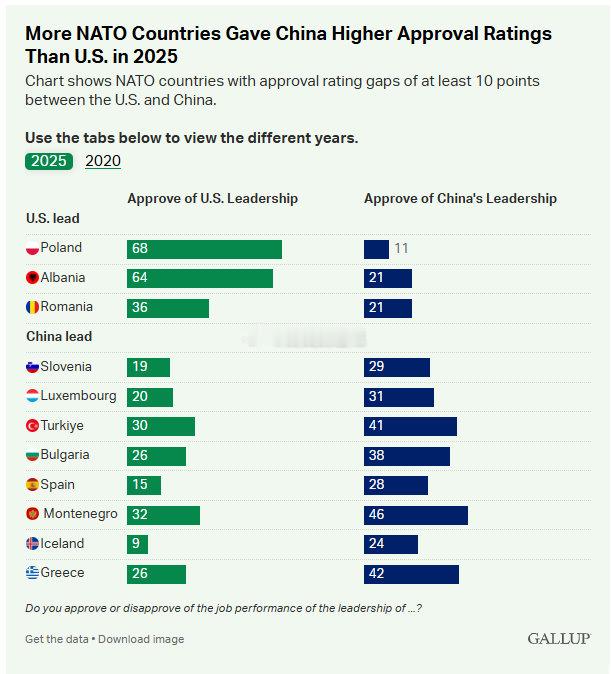 特朗普因格陵兰岛向欧洲8国加税盖洛普民意调查显示,2025年,美国在北约盟国中的形象明显下滑,在31个国家中,美国领导力的中位支持率下降了14个百分点,降至21%。而在被调查的北约国家中,中国领导力的中位支持率上升8个百分点至22%,是中国在北约中单年支持率增幅最大的一次。具体而言,在斯洛文尼亚、卢森堡、土耳其、保加利亚、西班牙、黑山、冰岛和希腊等8个北约成员国中,中国的领导力支持率显著高于美国10个百分点以上。而美国则在波兰、阿尔巴尼亚和罗马尼亚3个国家中领先中国。其余20个北约成员国对美中两国的评价统计上差异不显著。上述结果基于2025年3月至10月在北约31个成员国所进行的调查。