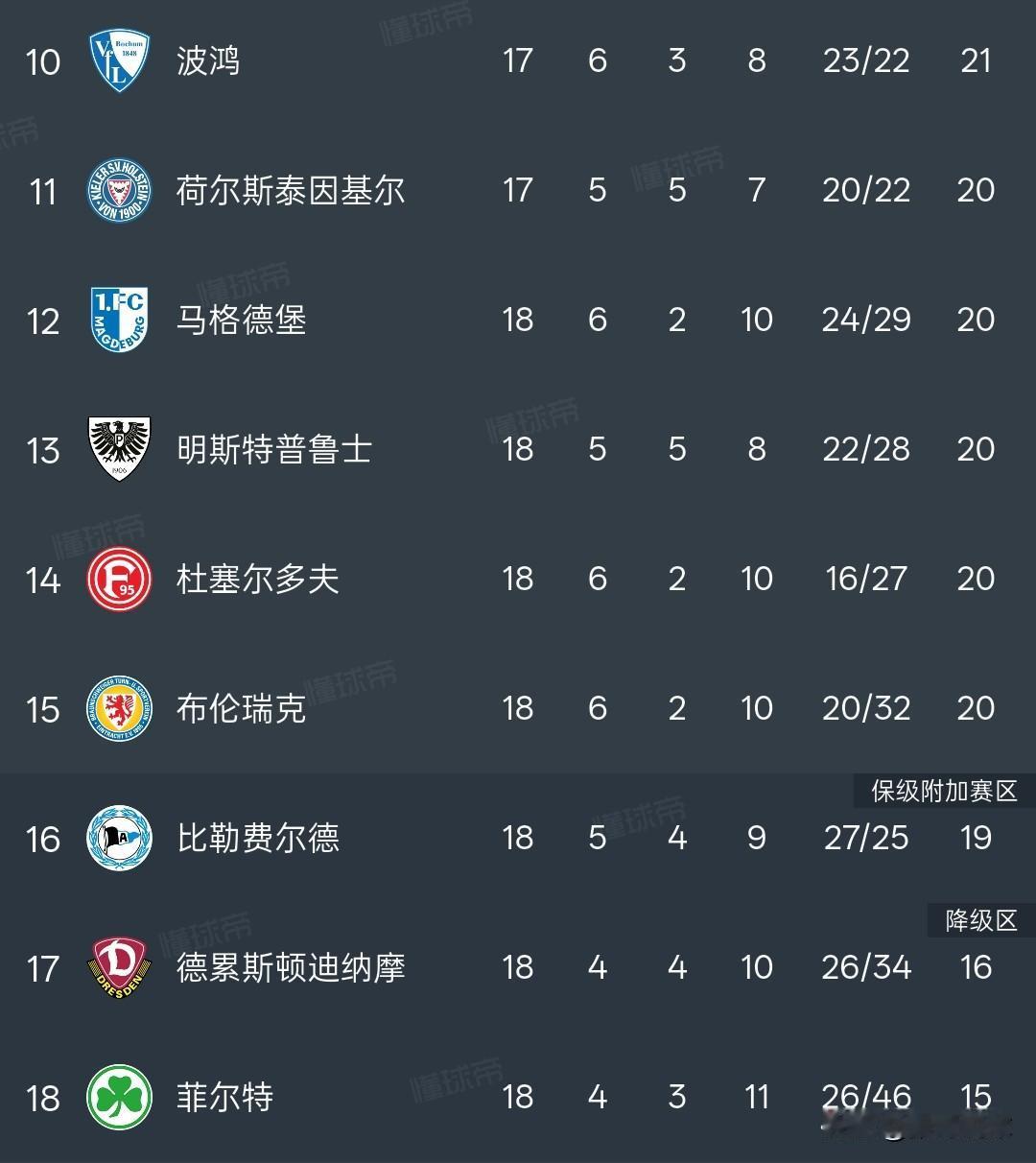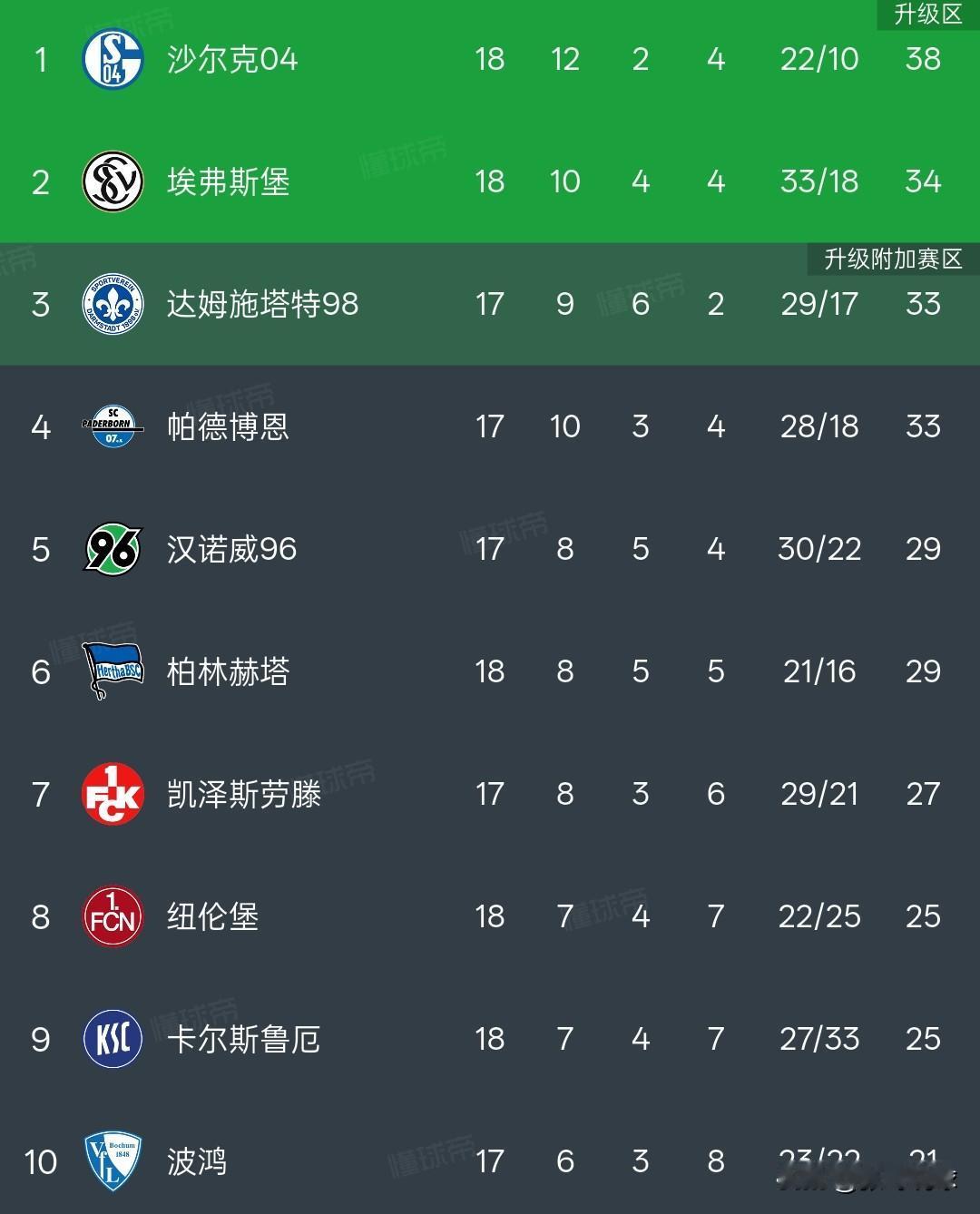 德乙积分榜丨沙尔克0:0战平柏林赫塔排名榜首,沙尔克04拿到38分,沙尔克04连续两轮不胜,多赛一场的情况下领先第三名5分,这个优势不算大。 老牌德甲球队汉诺威96和柏林赫塔也有机会,包括凯泽斯劳滕特和纽伦堡,菲尔特排名靠后,大概率会降级。德乙少了汉堡,关注度也明显下降。