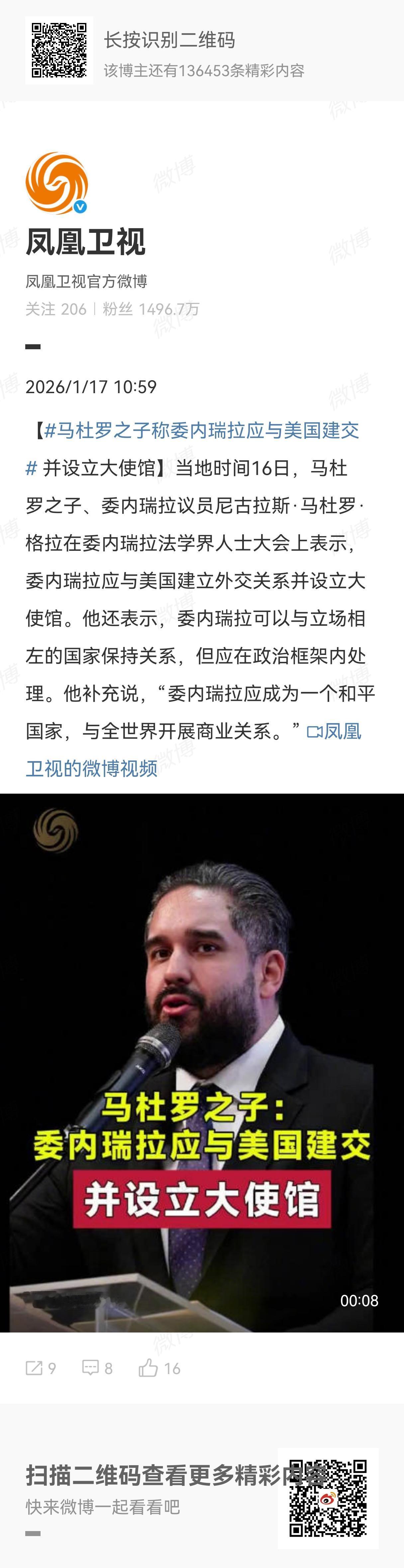 当地时间16日,马杜罗之子、委内瑞拉议员尼古拉斯·马杜罗·格拉在委内瑞拉法学界人士大会上表示,委内瑞拉应与美国建立外交关系并设立大使馆。此话一出,世界哗然。一只战斗的公鸡,战斗最酣的时候,突然停止战斗,跟黄鼠狼说我们不打了,我们和好吧。黄鼠狼听了怎么想?黄鼠狼想的是你个傻子!然后张开大嘴一口把鸡吃下去。听到这话最寒心的是古巴,古巴的32名烈士棺椁刚刚回国,就听到誓死保卫的另一个国家要和敌国建交,怎么想都很难受。
