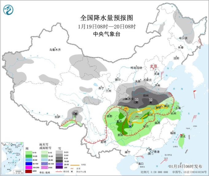 19日为雨雪冰冻天气的最强时段,陕西南部、河南南部、山西南部、安徽中北部、湖北西北部等地部分地区有中到大雪,局地暴雪(10~19毫米);重庆北部、湖北中部、湖南西北部、安徽南部等地部分地区有冻雨。