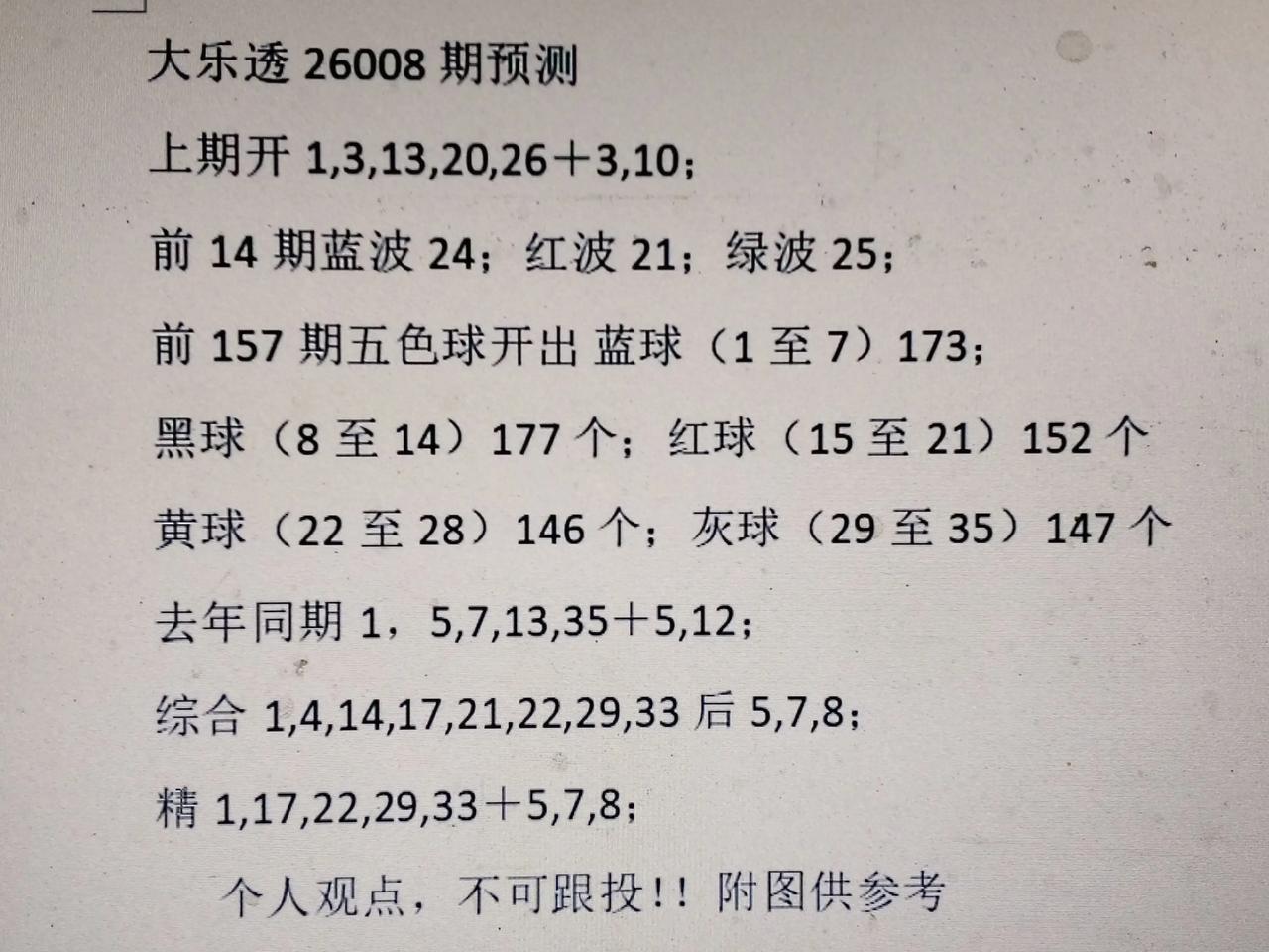 上期前区3尾两个,3尾开四期,本期估计还有。开出三蓝波两红波,无绿波。本期估计红波2个,绿波3个。 后区上期开出全蓝波号。本期估计5,7,8,有号开出! 上期精选一注中2十2。