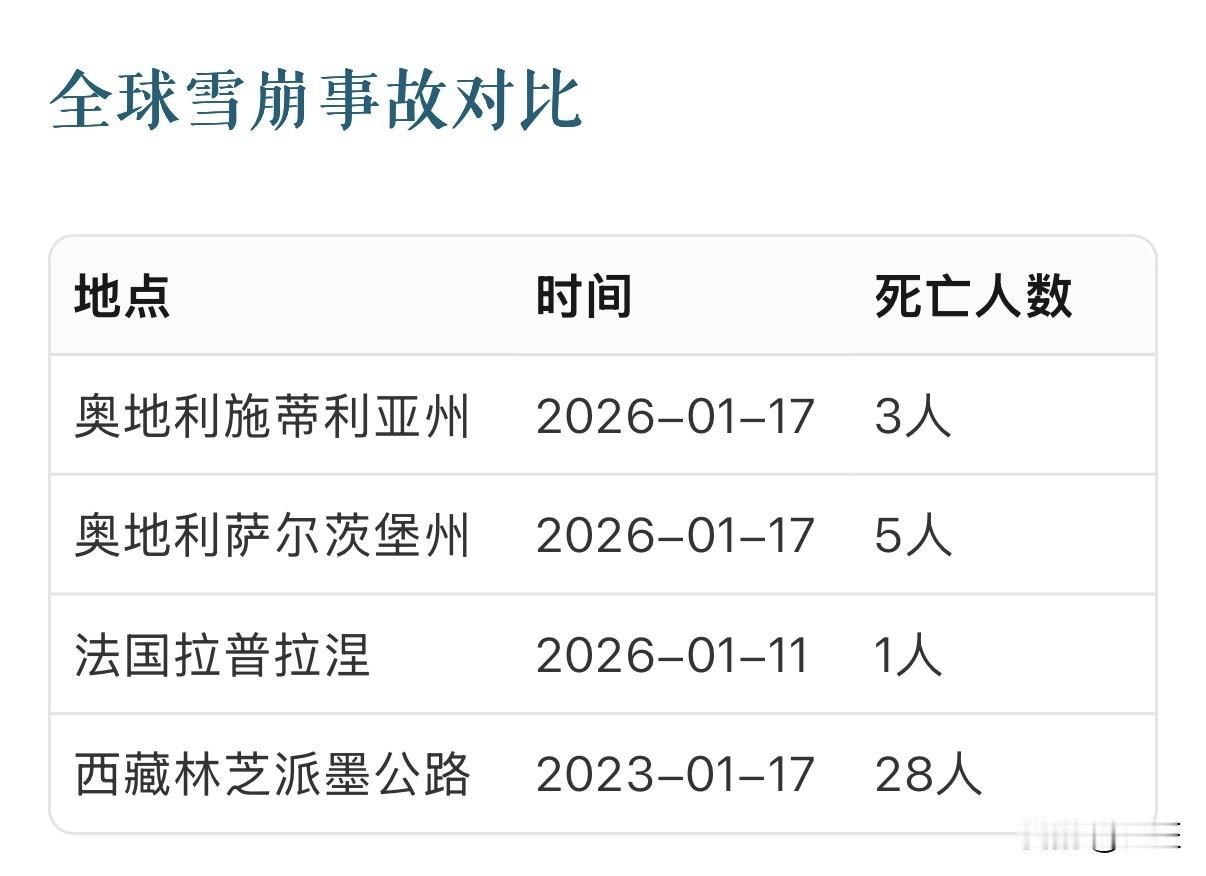 阿尔卑斯山雪崩 2026年1月17日下午,奥地利《皇冠报》报道施蒂利亚州普斯特瓦尔德地区发生致命雪崩,造成3人死亡 。 根据奥地利权威媒体报道,这起雪崩发生在施蒂利亚州普斯特瓦尔德地区,当时正值滑雪旺季。事故发生时,遇难者可能正在非正规雪道区域活动,这增加了遭遇雪崩的风险。 值得注意的是,这是阿尔卑斯山区近期系列雪崩事故的一部分。 就在同一天,奥地利西部的萨尔茨堡州也发生两起雪崩,造成5人死亡。 法国阿尔卑斯山地区也在1月11日发生雪崩,导致一名英国滑雪者死亡。 瑞士滑雪场爆炸 阿尔卑斯山火灾 阿尔卑斯雪场 吉克普林雪崩 阿尔卑斯冰雪 瑞士雪灾 奥地利初雪