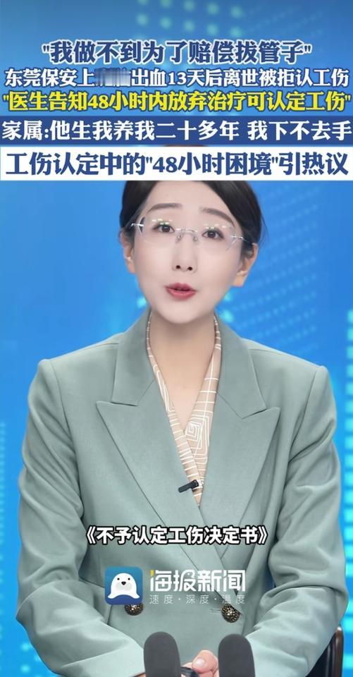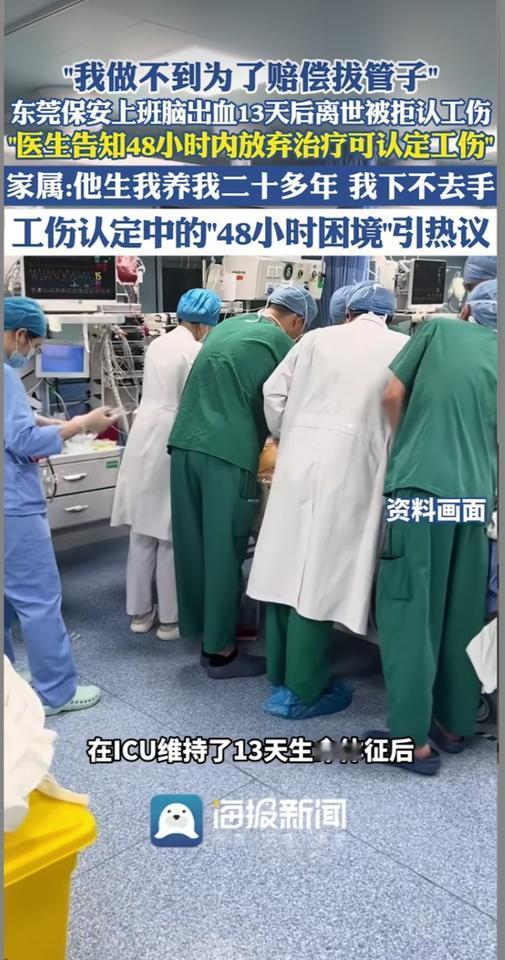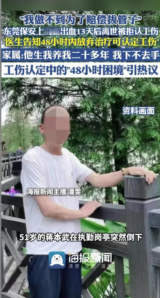 东莞保安岗亭突发意外!51岁蒋本武执勤时轰然倒地,一场关于亲情与法条的拉扯就此展开。 2024年11月1日早8点半,麻涌镇豪丰工业园门口,蒋本武突然昏迷在岗亭。工友紧急叫救护车,送医后颅脑CT显示脑出血62ml,双侧瞳孔散大到5mm,对光反射全失。 医生当场下了病危通知:“脑干损伤不可逆,48小时内放弃可能符合工伤。”这话像块冰砸在家属心上。儿子蒋海红着眼眶拒绝:“他生我养我二十多年,我做不到为了赔偿拔管子!” 转进ICU后,蒋本武靠呼吸机和血管活性药物维持生命。医院记录显示,48小时后他仍无自主呼吸,GCS评分仅3分,毫无好转迹象。13天后,耗尽积蓄的家属带他返乡,撤机后不久便离世。 申请工伤认定时,东莞人社局直接驳回,理由是死亡时间超48小时,不符合《广东省工伤保险条例》。家属不服起诉,2025年10月开庭至今未宣判。 网友热议炸了锅:“亲情面前哪能算时间账?这规定逼人选孝心还是选赔偿”“48小时成了生死红线,难道脑死亡不算死亡吗?”也有理性声音:“法条是为平衡权益,但机械执行太寒心”。 豪丰公司也力挺家属,称机械适用规定违背立法本意。律师指出,最高检已有脑死亡视同工伤的判例,家属的伦理选择不该成剥夺权益的理由。 这场官司早已超出个案范畴,它叩问着法律刚性与人文温度的平衡点。当生命尊严遇上冰冷条款,期待法院能给出兼顾法理与情理的答案。蒋志伦 东莞小伙离世 蒋永庆