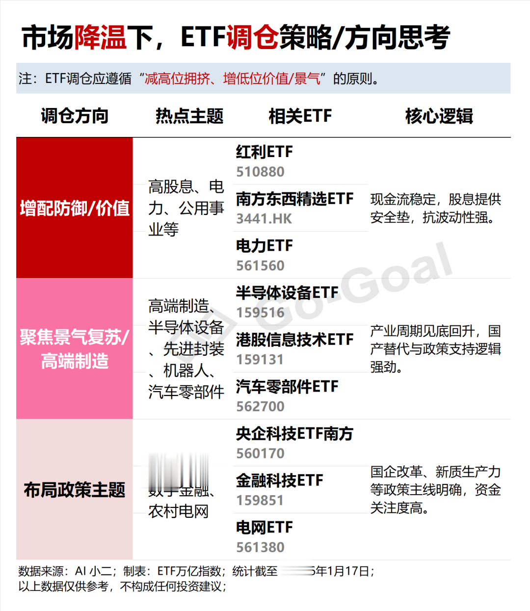 1.增配防御/价值:红利ETF(510880)、南方东西精选ETF(3441.HK)、电力ETF(561560)
