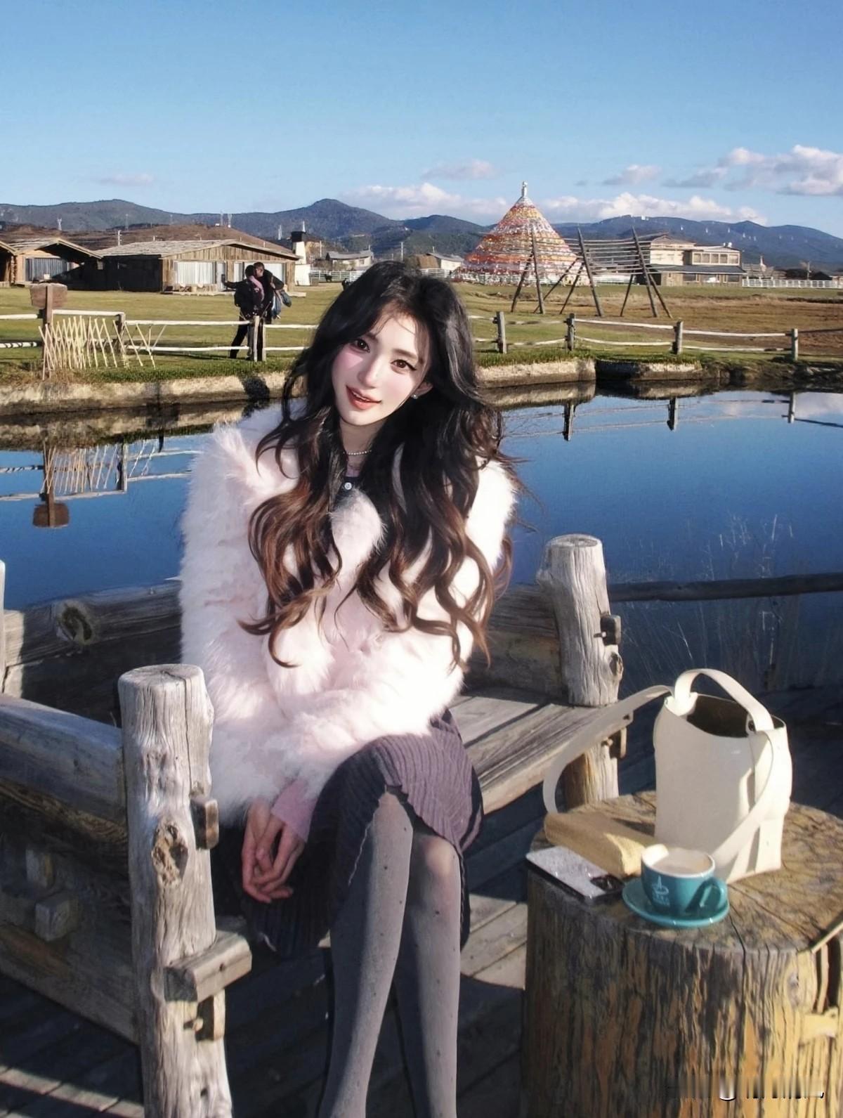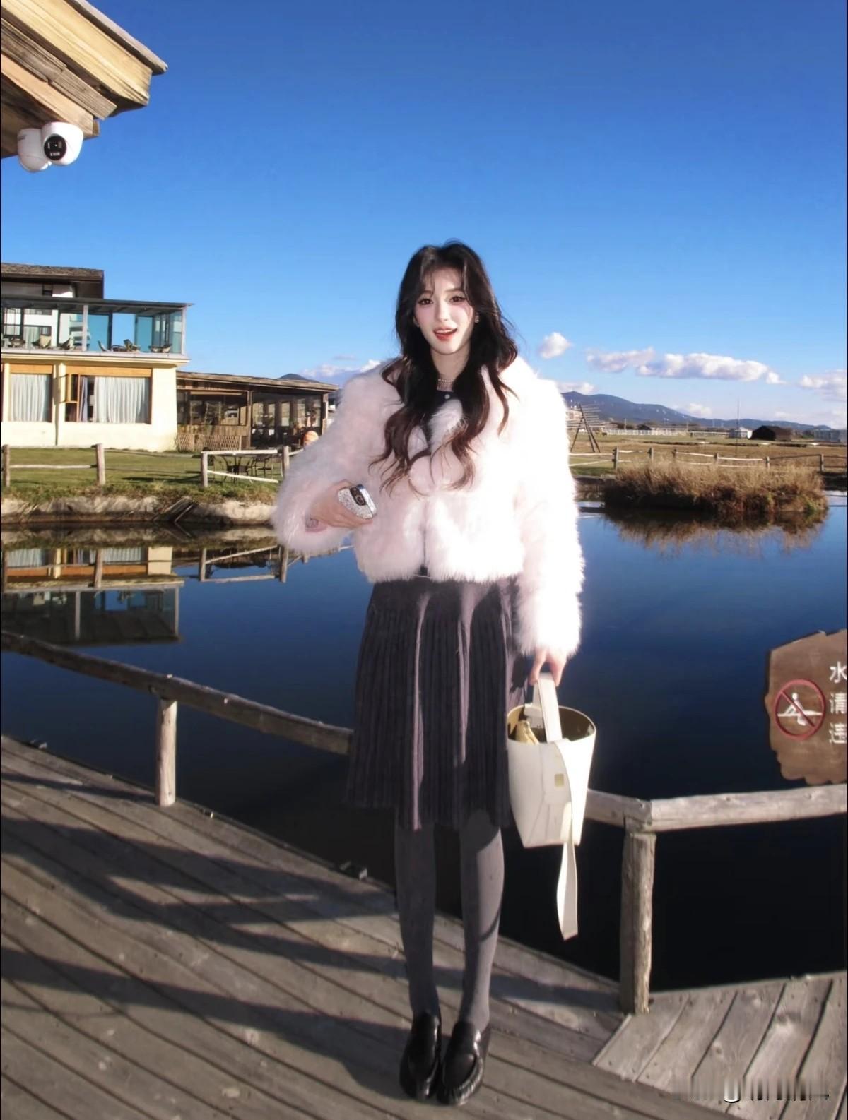 被这组湖边粉色皮草惊艳到了!冬天拍出温柔氛围感其实不难。最爱她手捧杯子坐在栈道上的样子,阳光软乎乎洒在粉色绒毛上,侧脸看向远处,特别松弛。没有刻意摆拍,就是那种冬日午后发呆的自然状态,但温柔又高级的氛围一下就出来了。 粉色皮草选得真心绝,雾粉一点不显俗,配灰黑下装刚好甜而不腻。在蓝湖棕栈道的冷色调里,这一抹暖色温柔又治愈,风吹过发丝和衣领的画面,像自带柔光滤镜。 发现没有?冬天拍照穿搭和环境融合太重要了。一件亮眼单品,一个放松姿势,再加点阳光和好心情,日常角落也能出片。你冬天最爱用什么颜色点亮沉闷季节?来分享你的冬日心动穿搭吧~