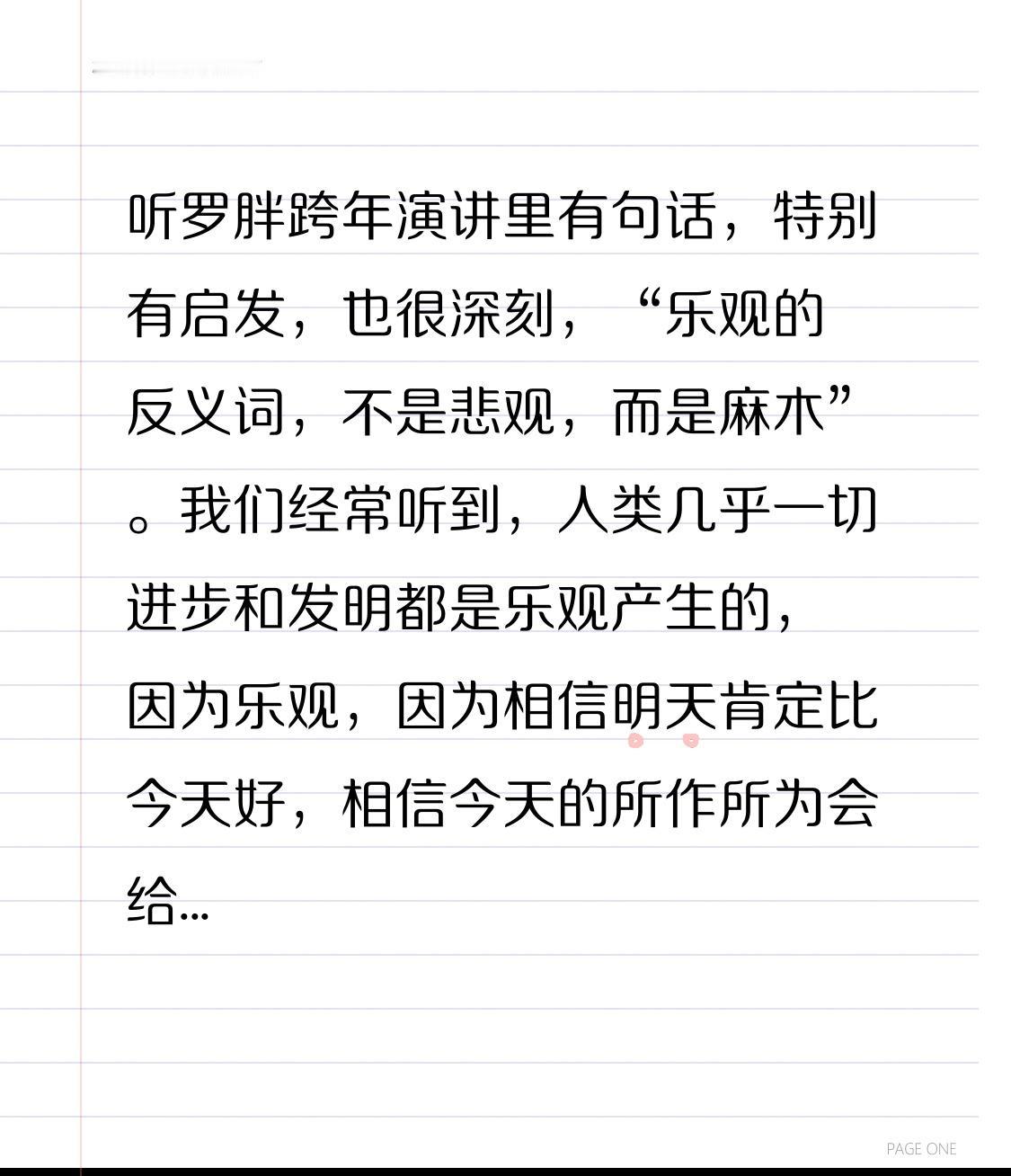 听罗胖跨年演讲里有句话,特别有启发,也很深刻,“乐观的反义词,不是悲观,而是麻木”。我们经常听到,人类几乎一切进步和发明都是乐观产生的,因为乐观,因为相信明天肯定比今天好,相信今天的所作所为会给后世子孙带来更好的生存条件,人类才有源源不断的探索,才会有层出不穷的发明创造。 而人类一旦麻木了,就等于麻团火焰熄灭了。因为麻木,所以就习以为常,因为麻木,也就逆来顺受,对一切变得无感,不想着改变,时间久了,人就被自己禁锢在了圈子里。觉得有一个词特别形象,就是“行尸走肉”,躯体虽在,但已经没有生机了。