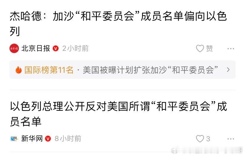 很有意思这两个新闻连着看有意思。特朗普公布的加沙和平委员会名单,内塔尼亚胡有意见,但是加沙的武装分子还说有利于以色列。海外新鲜事 这说明他们已经形成固化观念,无论美国做什么,都是以色列推动的。