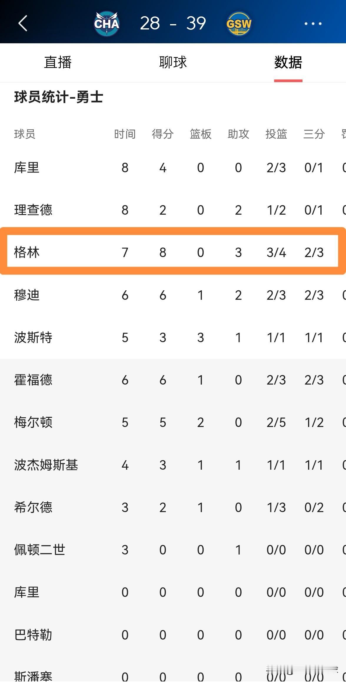 勇士恶汉追梦格林真是太让人惊喜了!在今天勇士主场迎战黄蜂的比赛中,目前双方的首节比赛已经结束,勇士以39:28领先对手11分。让人感到非常惊喜的是,在第一节比赛中,追梦格林竟然一反常态打出了非常高效的表现,他在首发出战的7分钟里,投篮4中3,其中三分球3中2非常高效的砍下8分,还有3助攻,他的场上正负值为+7。 值得一提的是,当追梦格林在第一节比赛中被替换下场休息时他得到了勇士主场球迷的热烈欢呼。