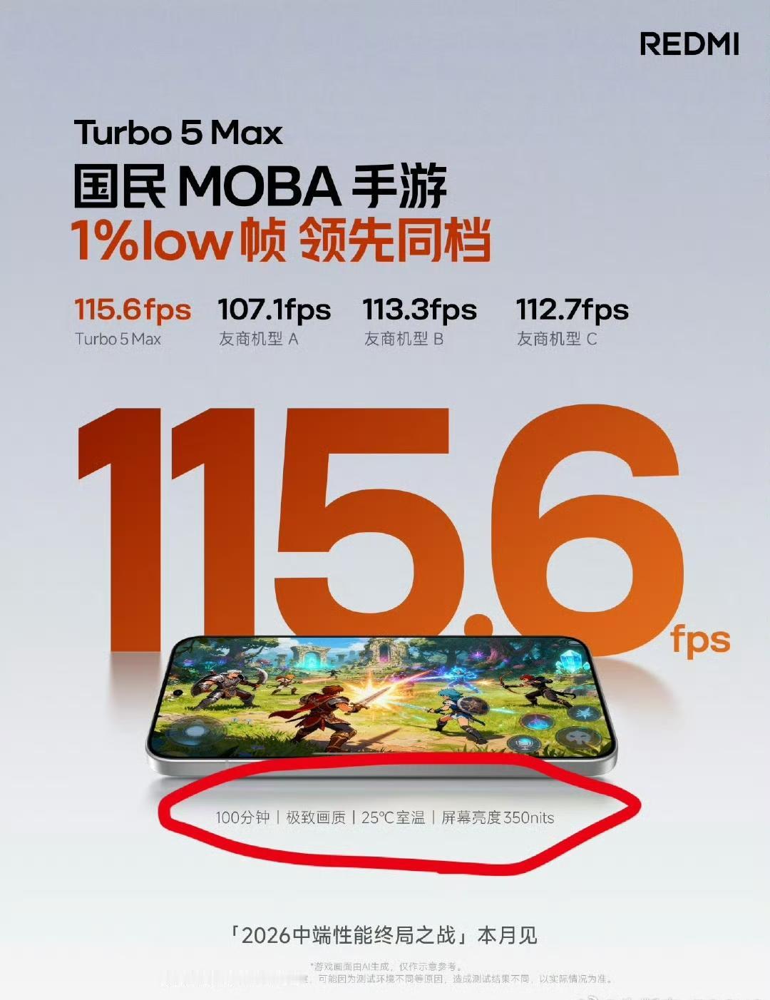 小米市场部应该是统一好意见了,不仅是小米汽车,现在REDMI手机也开始了。Turbo 5 Max的宣传海报,甩出数据的同时,把实验时的温度、时长、画质要求全放出来了。以前很多手机测试海报都是在极端情况下,甚至在空调房、冰箱里面做测试,那就是妥妥的耍流氓。但REDMI这个测试,明显更符合日常的使用场景。
