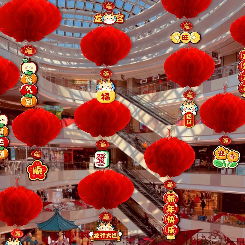推开商场那扇沉甸甸的玻璃门,一股热浪裹着甜腻的糖果香扑面而来。头顶是密不透风的红灯笼海,像一片倒挂的火烧云,把每个人的脸都映得红扑扑的。中央那瓶足有两层楼高的"福运当头"啤酒塔成了绝对主角——鎏金瓶身上盘着九条立体金龙,龙须里嵌着会呼吸的LED灯,一闪一闪像在眨眼。瓶口垂下的中国结流苏足有成人手臂粗,被空调风吹得轻轻摆动,扫过下方排队拍照的孩子们的发梢。