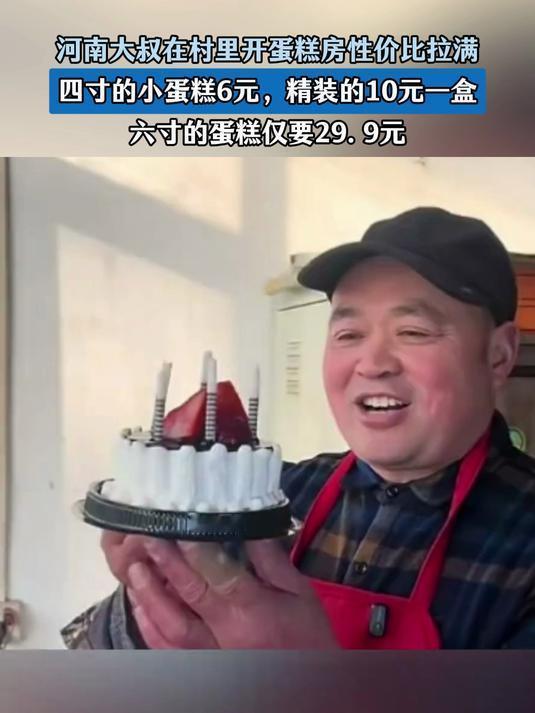 大叔卖6元四寸蛋糕日收入几百元,蛋糕界的蜜雪冰城 河南周口的乡村里,李大叔的蛋糕店没有醒目的招牌,只凭着一缕甜香,温暖了邻里的日常。清晨天不亮,自家小院的厨房就亮起灯光,面粉、奶油的香气混着晨光漫开,李大叔和家人围着操作台忙碌,一场长达14小时的坚守,从这份甜蜜开始。 4寸蛋糕10元,6寸29.9元,这样的价格在城市里难以想象,连包装盒都要花1.5元。没有房租压力,原料取自本地,一家三口分工协作,揉面、裱花、打包,每一步都透着实在。每日八九十份的订单,不算惊人,却要耗费整日心力,一天忙下来,收入也只有几百元。 这份朴素的生意,意外通过抖音走红。视频里,没有精致装修,只有斑驳的墙面和家人默契的笑容;没有网红营销,只有实打实的分量和亲民的价格。邻里街坊带着孩子来选购,为生日添一份甜,为寻常日子寻一份慰藉,这份稳定的信任,成了小店最坚实的支撑。 薄利多销的背后,是一家人相守的温情,是乡村创业者的通透。它不与城市的品牌溢价攀比,只在方寸蛋糕里,藏着对生活的热忱。这缕甜香,不仅甜了乡亲的味蕾,更藏着下沉市场最动人的生存智慧,也让我们看见,最朴素的坚守与陪伴,自有力量。
