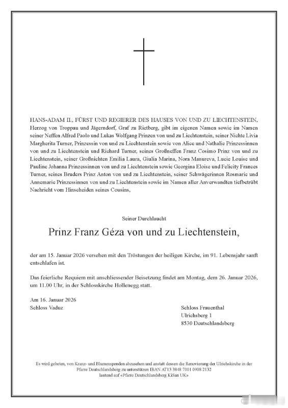 列支敦士登王室🇱🇮1月15日,列支敦士登王子弗朗茨·格扎逝世,享年91岁。与希腊艾琳公主同天去世,王子是汉斯-亚当亲王的三代堂哥。世界各国王室