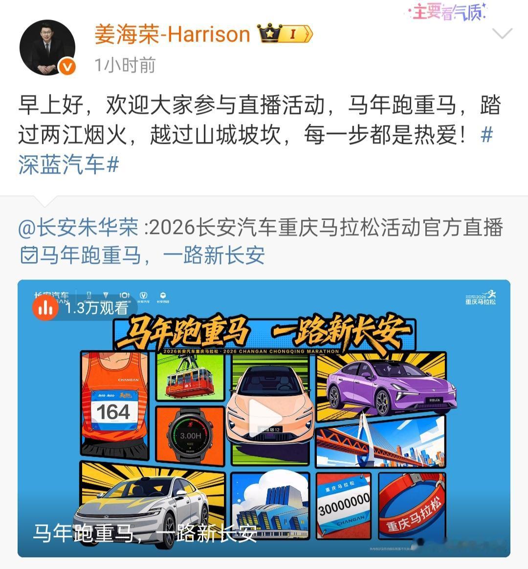 长安汽车在重庆举办了马拉松活动。1月18日早上,长安汽车旗下的深蓝汽车CEO姜海