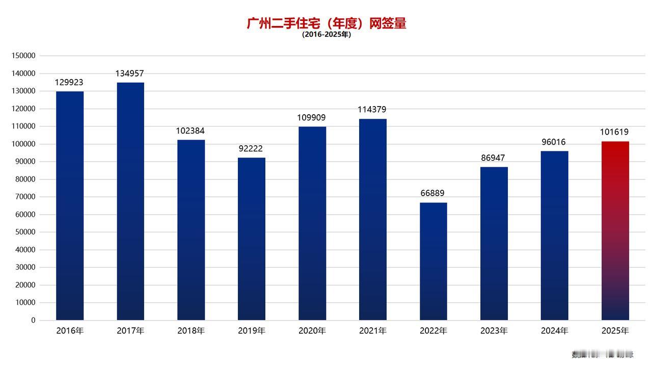 2025年,广州二手住宅共网签101619套,虽然网签量不完全等于最终的过户量,这个原因我也讲解过很多次,但只要统计口径保持一致,数据就可以拿来使用,毕竟任何一个平台都没有最终的过户量,即使有,都只是相对更滞后的数据,无法及时反映市场的活跃度。 通过图片可以看到,近十年(2016-2025)来,广州二手交易最旺盛的年份和网签量: 第一名:2017年,134957套 第二名:2016年,129923套 第三名:2021年,114379套 第四名:2020年,109909套 第五名:2018年,102384套 第六名:2025年,101619套 第七名:2024年,96016套 第八名:2019年,92222套 第九名:2023年,86947套 第十名:2022年,66889套 如果仅从“量在价先”的原则来看,反过来看,2022是第一【抄底年】,2023是第二【抄底年】,但如果结合成交价来看的话,2023年反而是以珠城为首的房价峰值年份! 其实,早在2019年的时候,广州二手楼市已经隐隐出现“购买力后劲不足”的情况,如果没有疫情打乱了整个“社会、市场、经济”等的发展节奏和计划,我估计广州楼市的表现大概会是“2019探底,2020筑底,2021横盘,2022逐渐复苏,2023年小幅度反弹”。 2022-2023年的“复苏至反弹”会是更大范围,但房价涨幅更低的、相对健康的楼市表现。当然,现在我说这些都是纯粹个人推测,始终历史就是历史,历史不可改变。但我们可以从历史中学习,优化、提升。 我脑海临时想起一些事情,就是高三的时候,我们参加学校组织的无偿献血,有几个男同学抽完血后可以马上打篮球。那时候年轻,又不知道“怕”,胆粗粗,所以三分、逼抢、灌篮都没问题。 但现在年纪大了,身体质素肯定比不过18岁的时候,而且胆量也小了。别说献血,就是羊了后康复初期,我估计当年这些勇猛的男同学都不会“拿条命仔来教飞”。今时不同往日,身体状况不佳的时候,最好是休息,让身体慢慢康复,假如强行用药,可能短时间内能提起精神,但事后多少都会有些副作用,甚至对身体造成伤害。 说回这个“广州二手年度网签量”,比较正面的数据,就是从2022年开始至2025年,网签量都在逐渐递增。但不能单一地看年度成交量,还要综合考虑“同一时期的挂牌量、常住人口/户籍人口数量、利好政策的数量/力度/范围”。 二手网签量连续四年递增,仅仅从数据上看,一定是积极的,是进步的。但如果你再回头看看2024年528、2024年929等多个重磅利好政策,结合人口增量(即潜在买家)和挂牌增量等去看,那逐年递增的成色不算高。而且是“以价换量”得来的。 我知道会有人反对,但大家再耐心对比一下2016、2017,那时候我们大广州的人口没有现在多,房屋也没有现在那么多(选择),地铁数量和新兴产业也比现在少,那为何那时候的网签量比2025年还要多呢?即使是2018年,也比2025年多。 这是值得大家冷静下来思考的。 虽然成交数据是滞后的,但是以目前楼市状况、经济环境来看,已经很难像以前那样说涨就涨、说反弹就反弹。 楼市就像我高中时代的男同学,我们一起开心过、刻苦过,有笑有泪,有很多美好的回忆。但年纪大了,细胞恢复、新陈代谢等那些都不复当年勇了。剧烈运动也尽量少做了,不小心扭伤,康复时间比年轻时候需要更长的时间。 尽管我心态上仍然觉得自己很年轻,也时常回忆起那些年的往事,但身体肌能、精神状态等,每个人的内心最清楚。 我现在和18岁的男生比体能肯定比不过,我又不是C朗,但我的工作经验、社会阅历、资源等都是我的优势。我明知道跑不过这些年轻小伙子,那我就不按照自己的节奏来跑就是了。 我相信,广州楼市终会有复苏的那一天,但需要时间,而且,它早就不是那个18岁狂奔的少年了。不能永远都依赖土地财政,但广州有自身的经贸优势、旅游文化美食等优势,发挥好了,又是另外一片天地。 最后,可能有些人觉得这篇内容莫名其妙,但有些话,我不能、不敢、不想说得太白,只能说得隐晦一点,大家要细心品味才能明白我的意思。