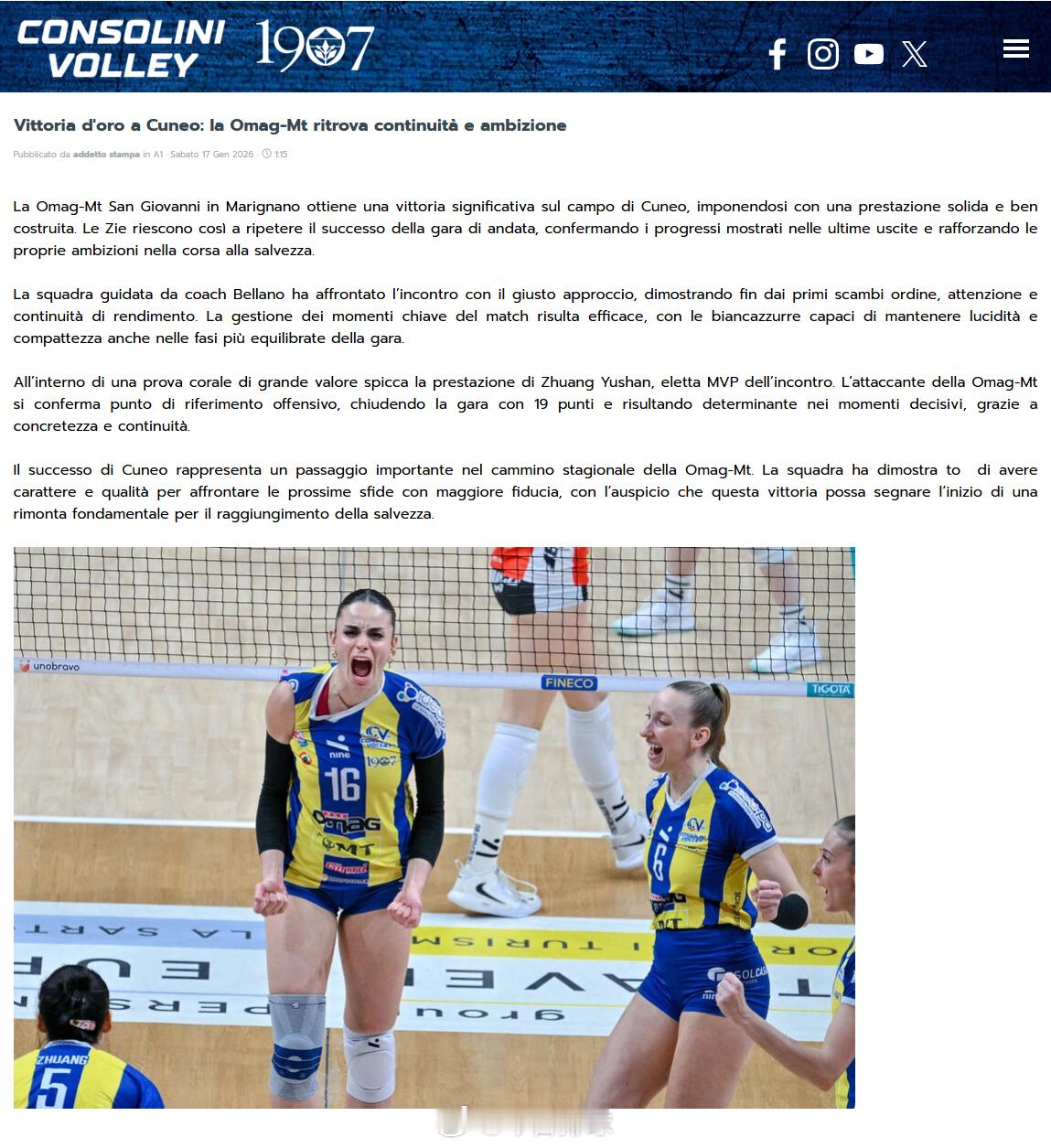 【圣乔瓦尼官网 | 在库内奥金光灿灿的胜利:奥马格-圣乔瓦尼队重拾稳定与雄心】庄宇珊庄宇珊留洋第一季 奥马格-圣乔瓦尼队在库内奥的赛场上取得了一场意义重大的胜利,凭借稳健而流畅的发挥赢得了比赛。这场胜利延续了在第一阶段的成功,巩固了球队近期的进步,并增强了他们在保级征程中的雄心。贝拉诺教练的球队以正确的态度对待这场比赛,从比赛一开始就展现出了节奏、专注和稳定的发挥。他们对比赛关键时刻的掌控非常有效,即使在比赛势均力敌的阶段,身穿蓝白球衣的奥马格-圣乔瓦尼队也保持了清晰的思路和整体的凝聚力。在全队共同努力下,庄宇珊的表现尤为突出,她被评为本场比赛的MVP。这位奥马格-圣乔瓦尼队的主攻再次证明了自己是球队的进攻核心,全场砍下19分,并在关键时刻凭借稳定的发挥奠定了决定性的作用。在库内奥的这场胜利对奥马格-圣乔瓦尼队本赛季的征程而言意义重大。球队展现出了应有的韧性和实力,这让他们更有信心迎接未来的挑战,并希望这场胜利能成为他们保级成功的关键一役。