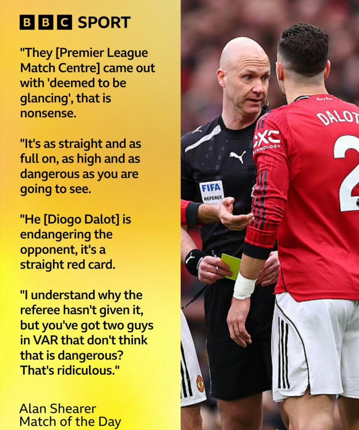 阿兰·希勒认为这一解释非常荒谬,这明显是威胁对手安全的红牌动作: “这是一种非常直接、非常猛烈、非常高、非常危险的动作,你能看到的最危险的那种。” “他(达洛特)是在危及对手生命安全,这就是直接红牌。” “我能理解裁判为什么没判,但你还有两个VAR在那儿,他们居然认为这不危险?这太荒唐了。”曼联2比0曼城,,,正常速度和慢放给人感觉区别很大,达洛特这个确实是刮过去,不是踩上,不过不给红的主要原因应该是比赛刚开始,这种裁判一般不愿意重罚。多库也是抗得住 换脆一点的球员这一踹真有可能赛季报销