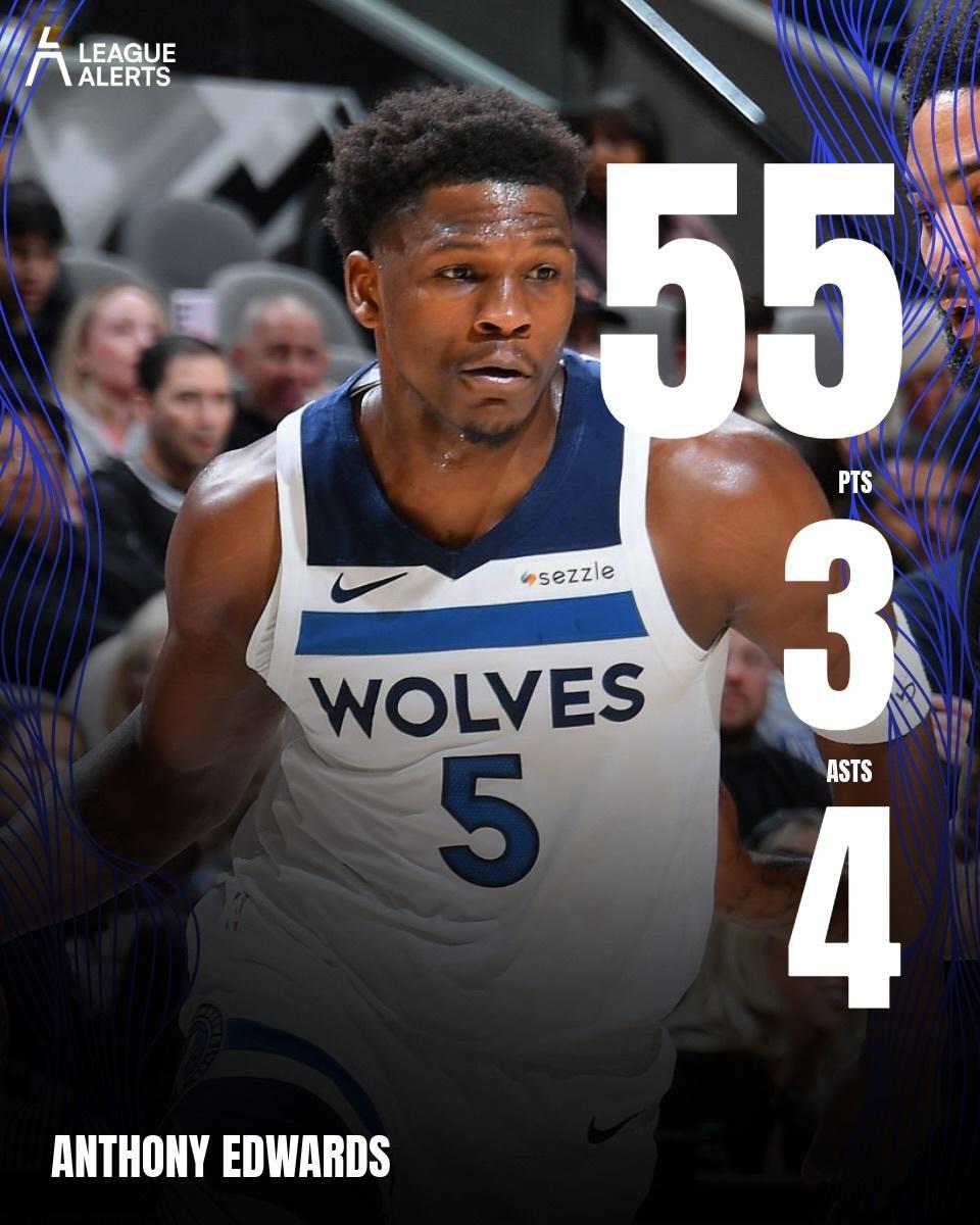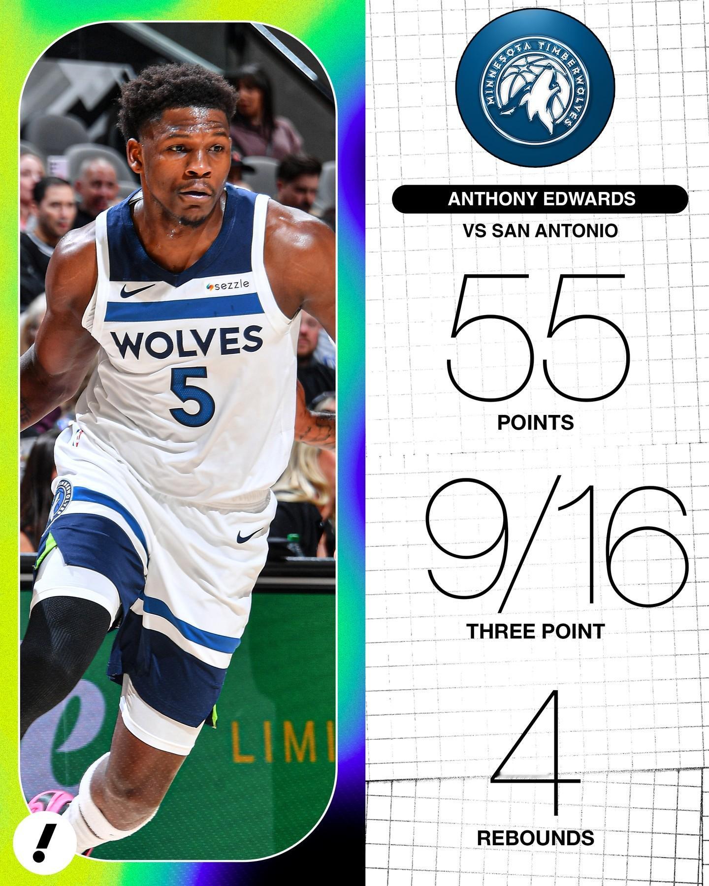 什么水平??今天的爱德华兹:——投篮33中19,三分16中9,罚球9中8——爆砍55分4篮板3助攻——55分生涯新高&本赛季所有球员第二高分真尽力了,第四节各种神仙三分,单节拿了26分!!!这赛季的华子太厉害了!!森林狼vs马刺