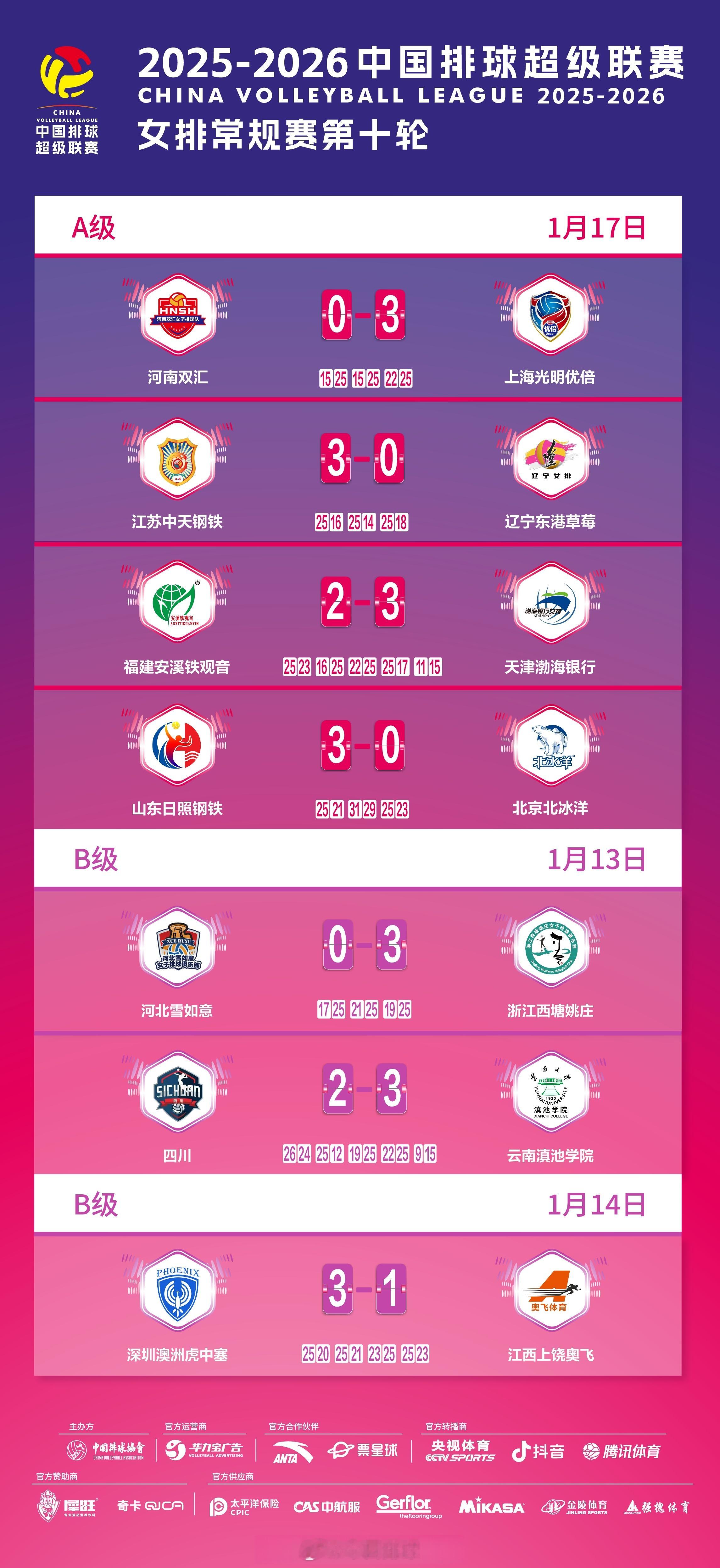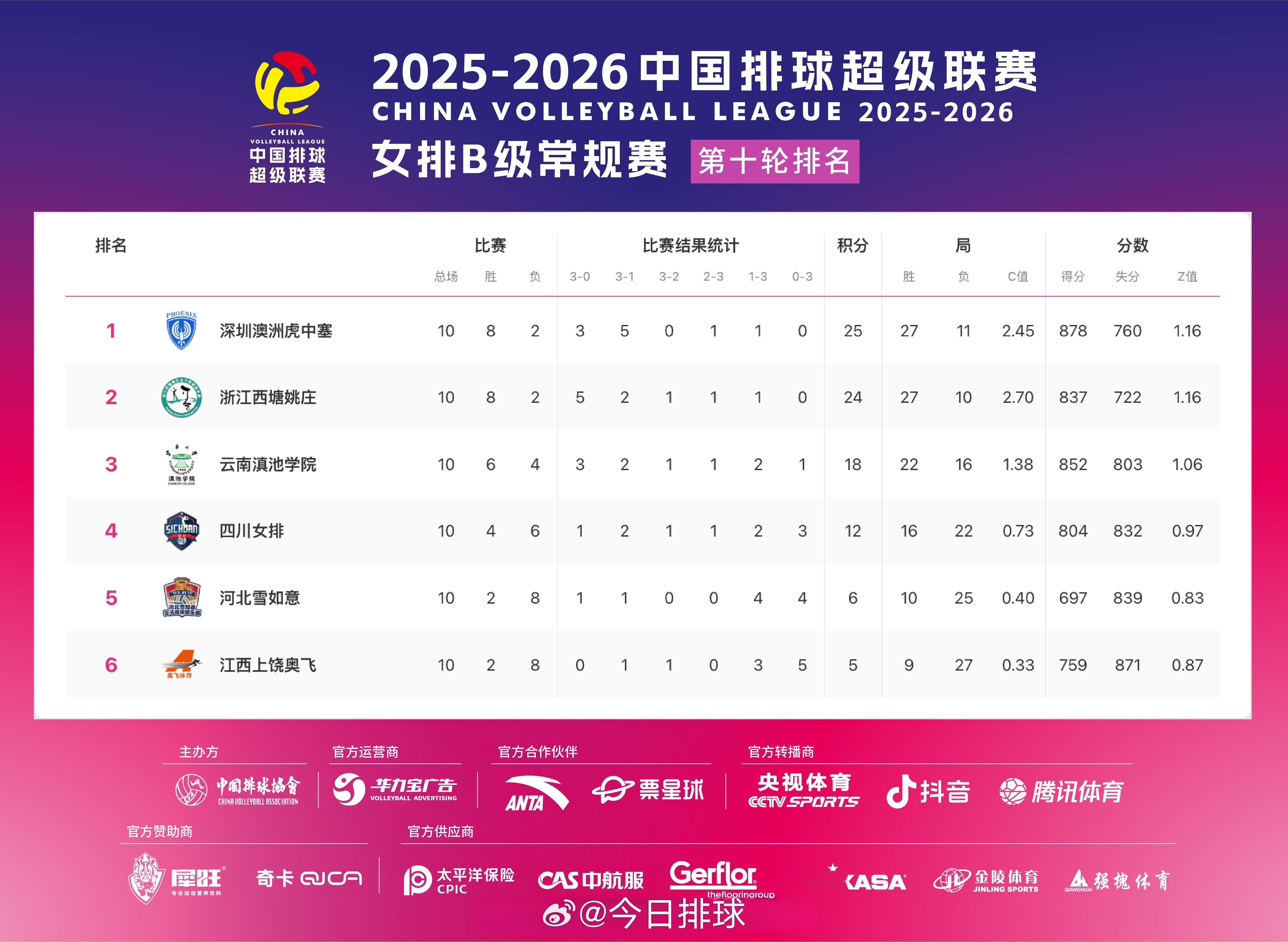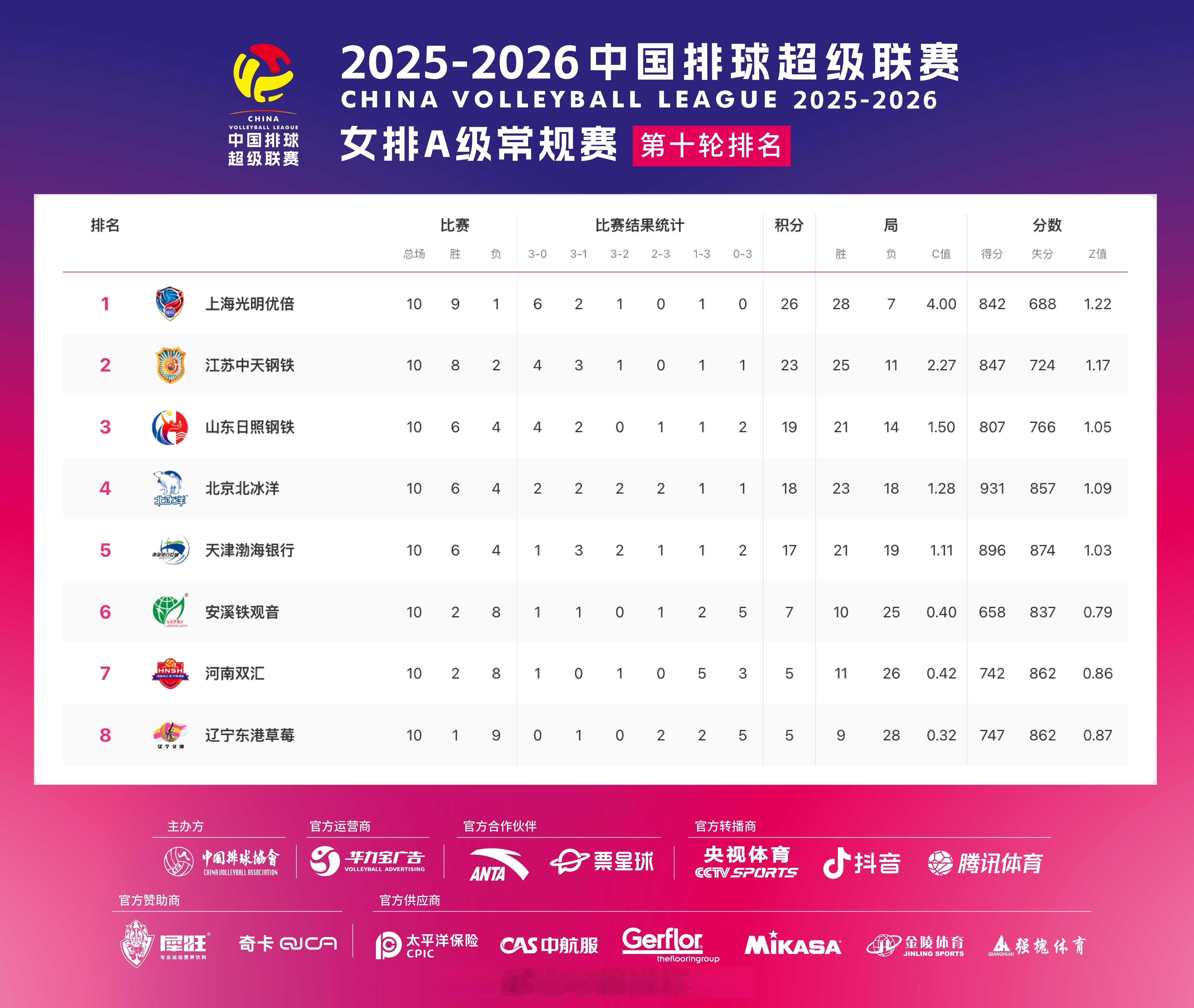 2025-2026中国女排超级联赛 A级和B级常规赛第10轮比赛结果,和此轮过后各支参赛俱乐部的积分排名。