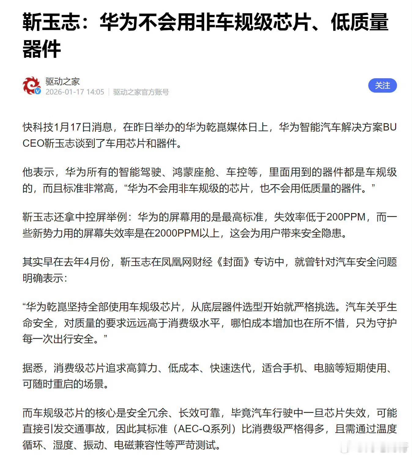 华为乾崑靳玉志:华为不会用非车规级芯片、低质量器件车规级芯片的核心是安全冗余、长期可靠。安全可不是口号,喊的震天响没啥用,得看他怎么做,华为乾崑坚持全部用车规级芯片!