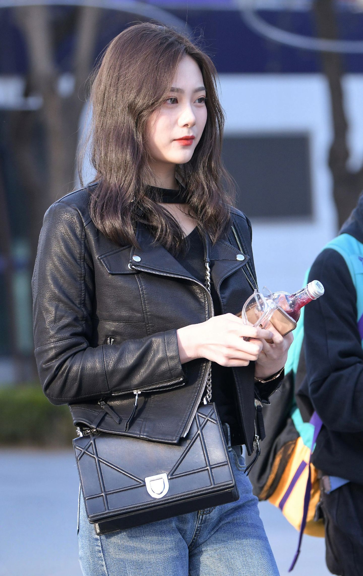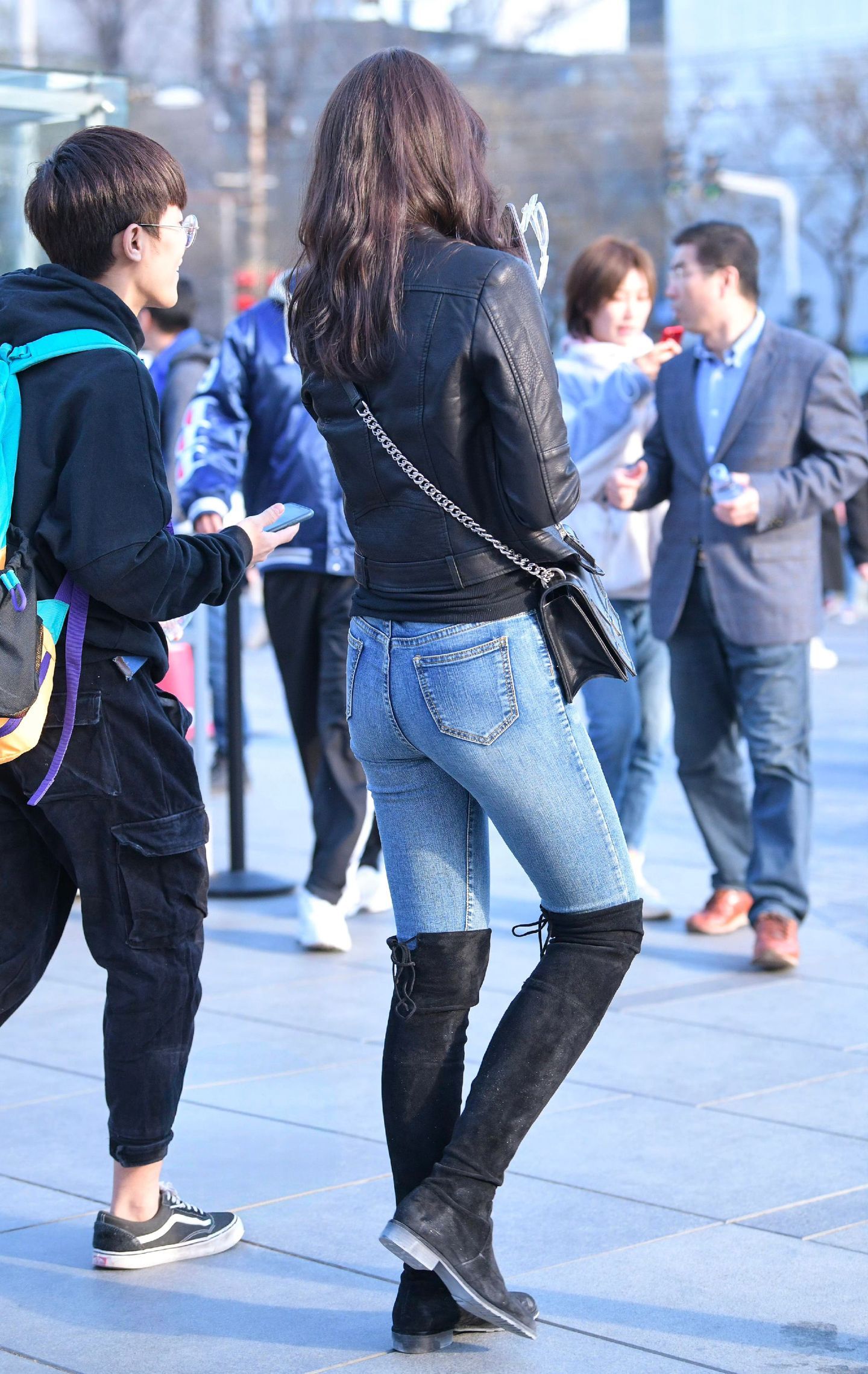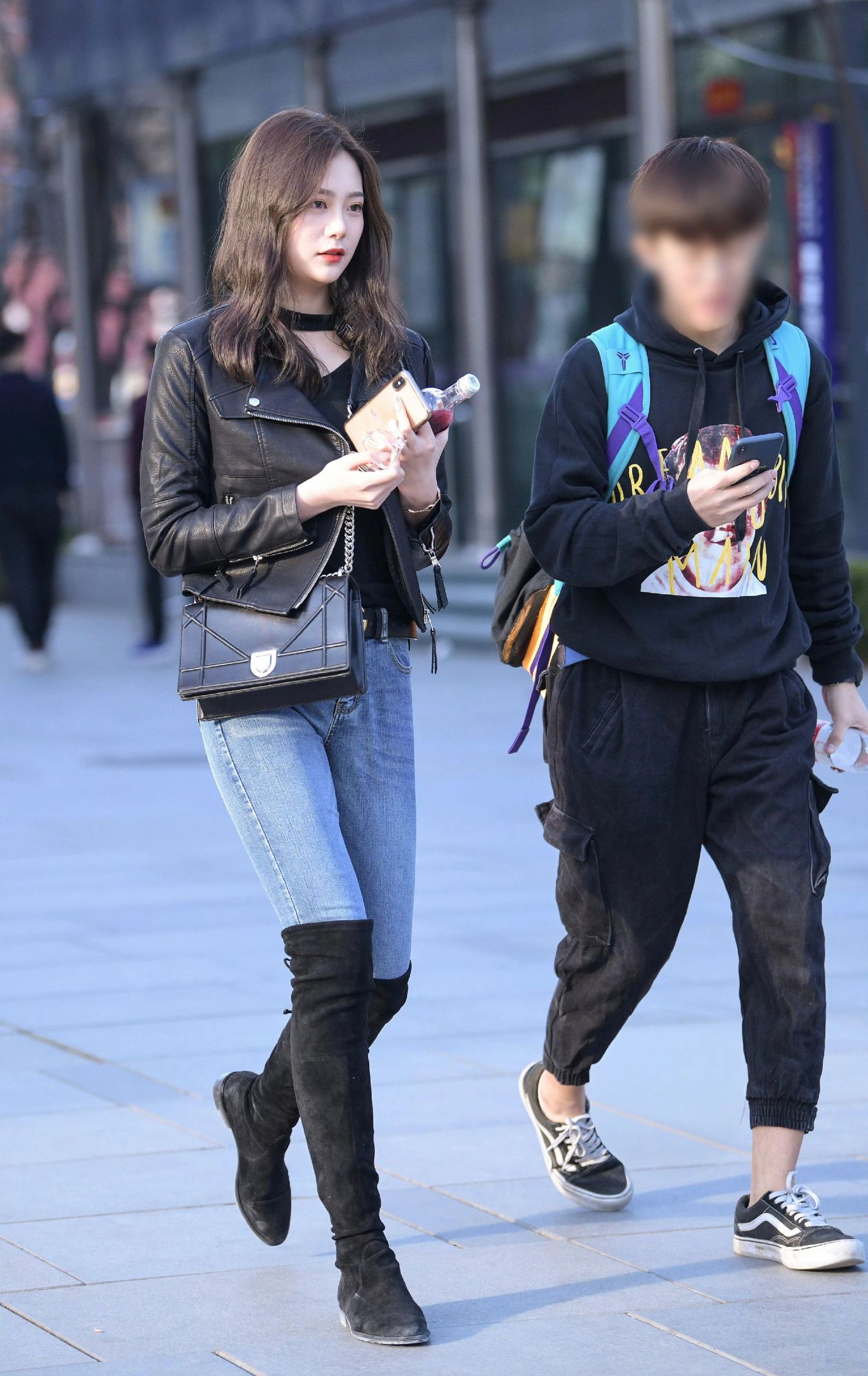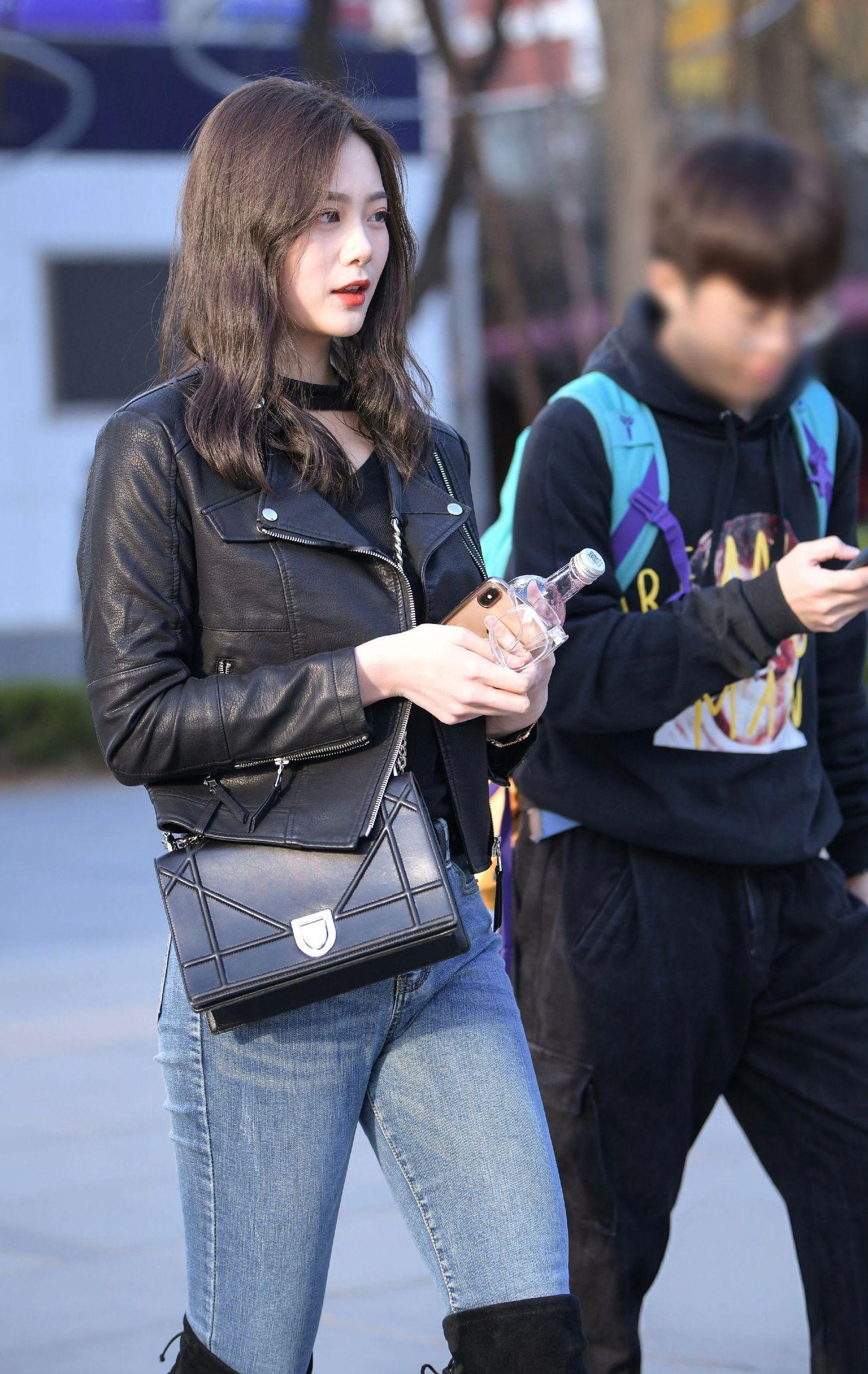 ootd穿搭 黑色机车皮衣搭配浅蓝色紧身牛仔裤,酷飒与利落感拉满,再踩一双黑色过膝长靴,瞬间拉长腿部线条,气场直接拉满。几何造型的黑色链条包作为点缀,让整体穿搭在帅气中多了几分精致,街头风的酷女孩穿搭模板就是这样啦~每日穿搭牛仔裤穿搭
