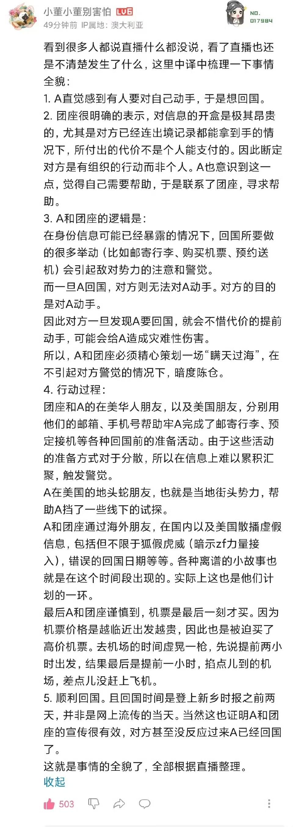 牢A直播讲述自己如何回国总结。 大概就是察觉到有人要对他动手,于是和朋友瞒天过海散布各种虚假信息,最后在对方没有察觉前悄然回国。