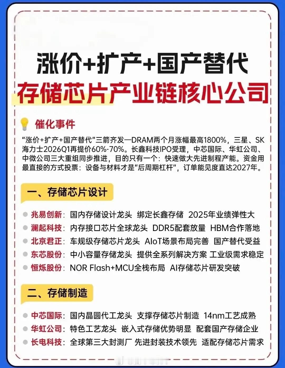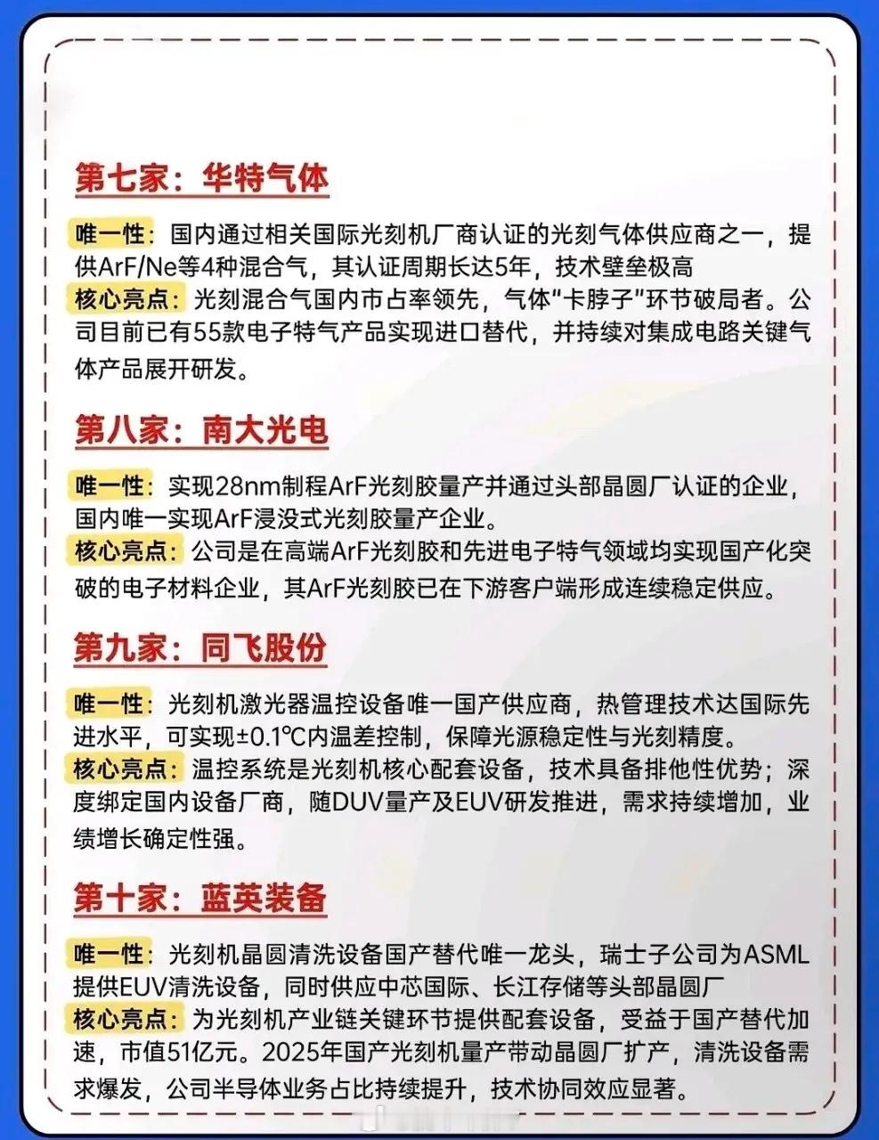 重磅分享:存储芯片6大方向+光刻机10大龙头梳理!🔥 炸了!国产半导体的“黄金时代”已来!一边是光刻机与光刻胶领域10家具备唯一性的硬核企业,在“卡脖子”环节实现技术突围;另一边是存储芯片产业链在涨价、扩产与国产替代的三重驱动下,从设计、制造到封测、材料全链条加速崛起。张江高科:作为上海微电子的第一大股东,是国产光刻机从技术突破走向量产落地的关键推手。佰维存储:凭借NAND设计+封测+模组一体化的全产业链布局,在存储领域建立了独特的竞争优势。福晶科技:国内唯一可提供高性能激光晶体的企业,深度绑定全球光源设备厂商,是光刻机光源系统的核心元器件供应商,占据全球80%的市场份额。投资有风险,决策需谨慎。上述风险可能直接影响相关企业的经营业绩与估值水平,建议投资者结合行业周期、企业核心竞争力及风险承受能力理性布局。