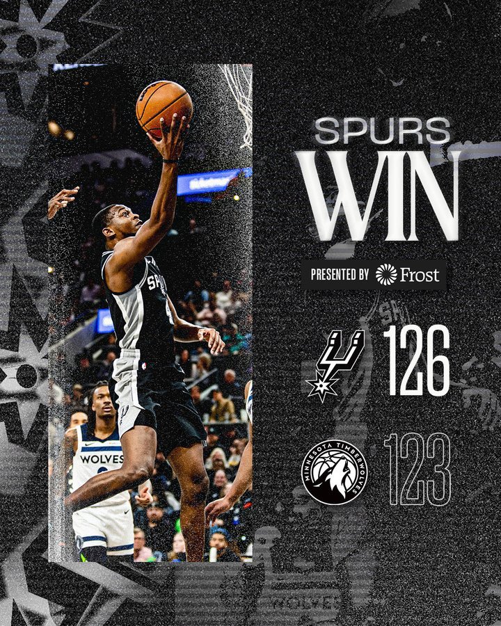 全场比赛结束!马刺主场126-123险胜森林狼,拿到两连胜🎉马刺(29-13)