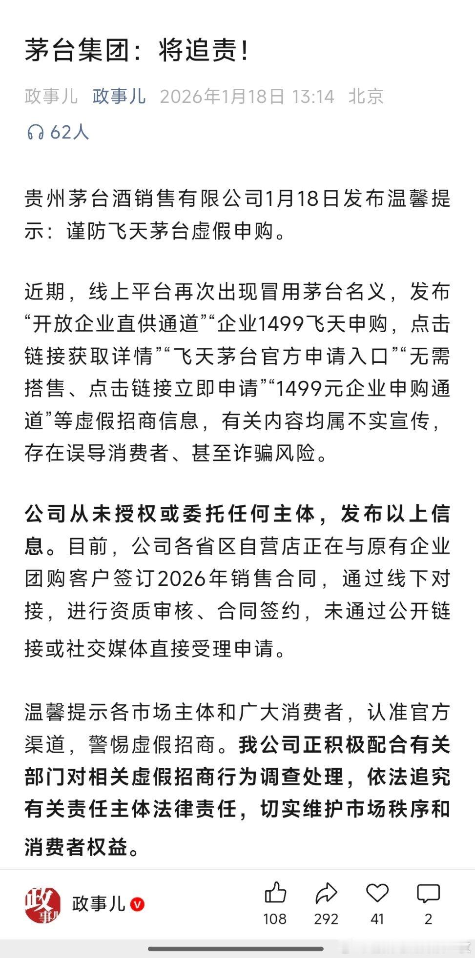 贵州茅台酒销售有限公司1月18日发布温馨提示:谨防飞天茅台虚假申购。