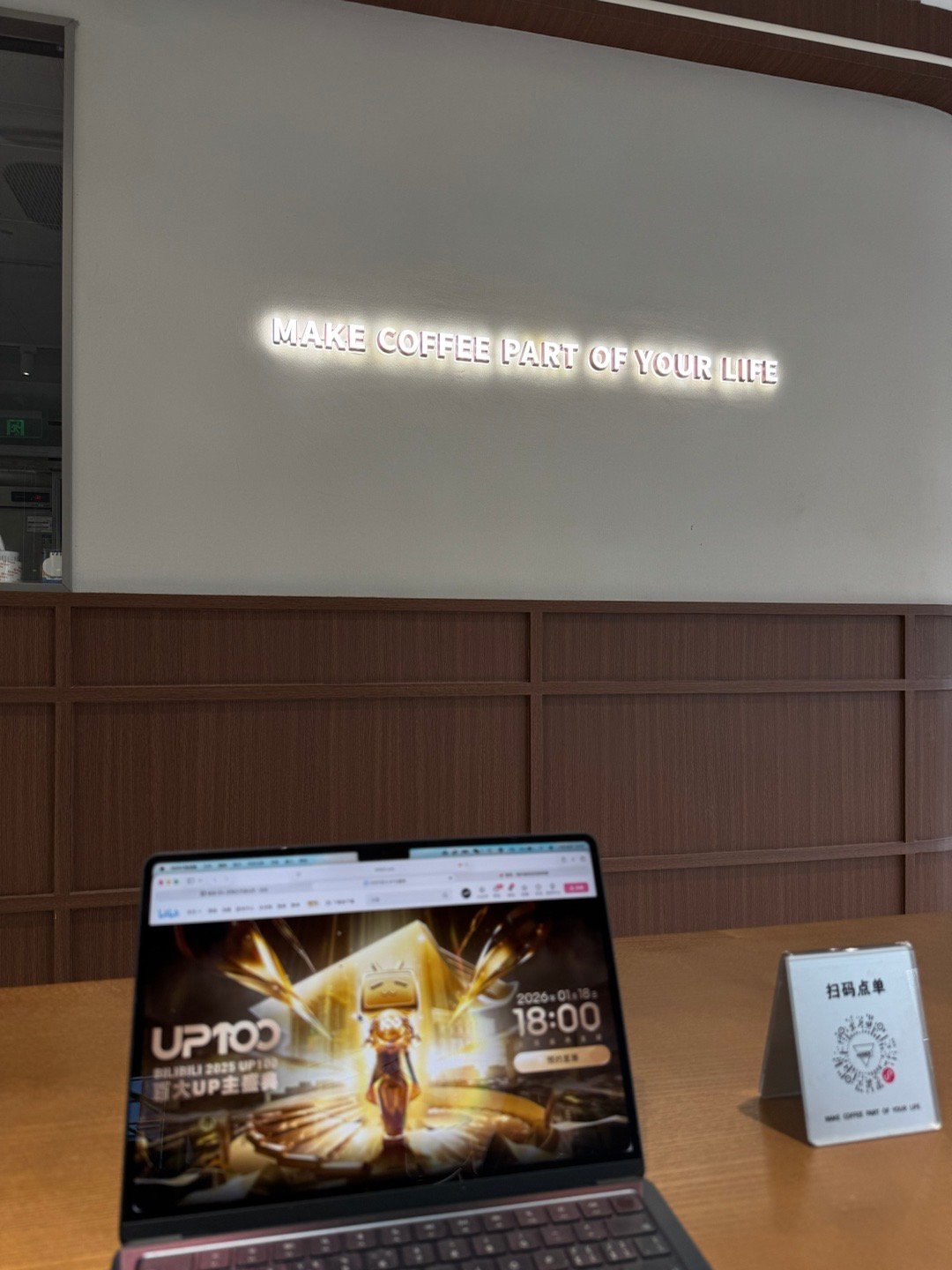 陪娃的下午,继续manner来杯冰美,打开电脑看看今年B站百大的消息。抬头一看,Make coffee part of your life.