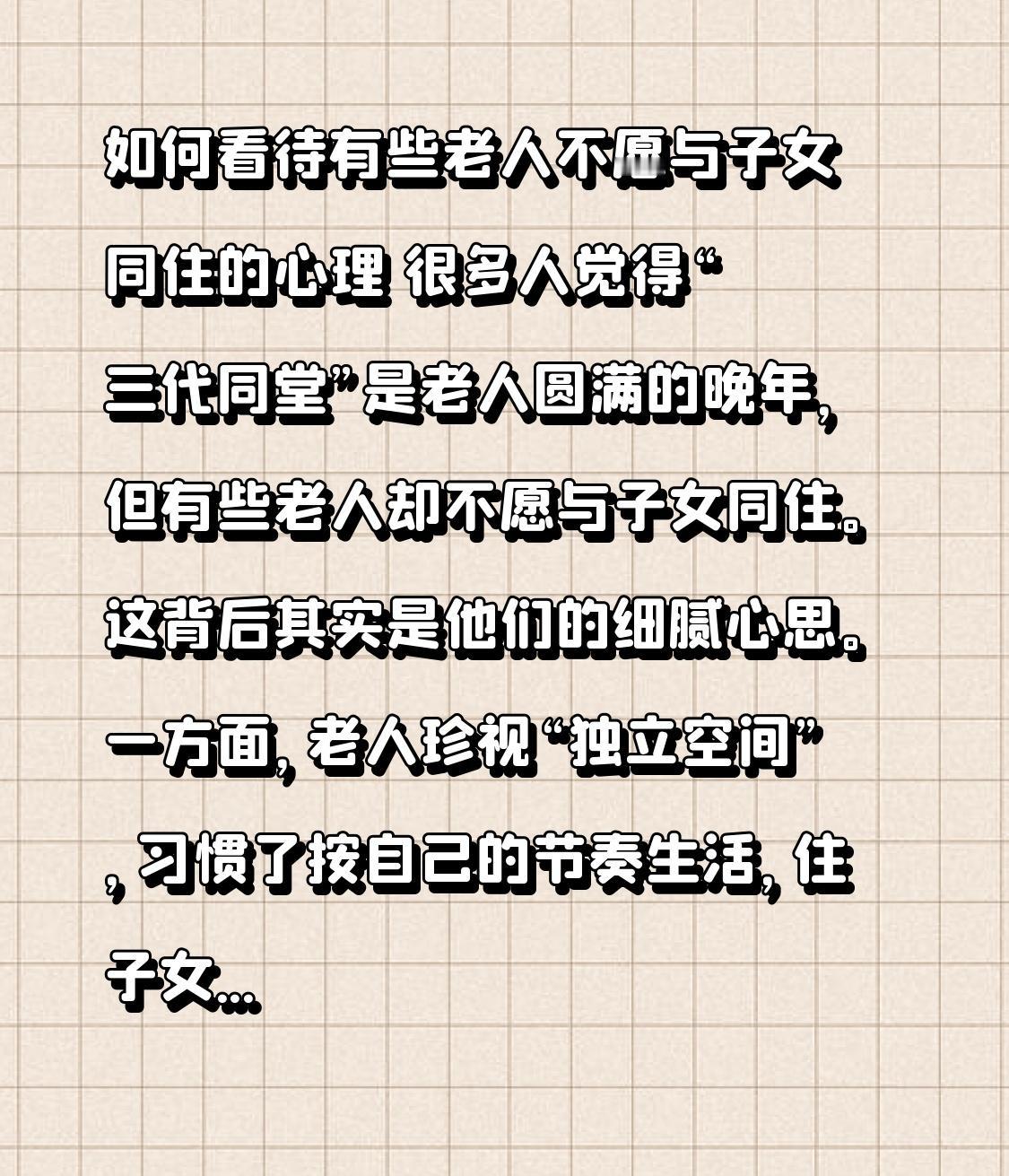 如何看待有些老人不愿与子女同住的心理 很多人觉得“三代同堂”是老人圆满的晚年,但有些老人却不愿与子女同住。这背后其实是他们的细腻心思。 一方面,老人珍视“独立空间”,习惯了按自己的节奏生活,住子女家会“束手束脚”。比如子女熬夜、聚会,老人会有诸多顾虑。 另一方面,老人不想成为子女的“负担”。他们怕自己的慢性病、清淡口味等打乱子女生活。他们用这种方式体谅子女,也守护着自己晚年的体面与尊严。