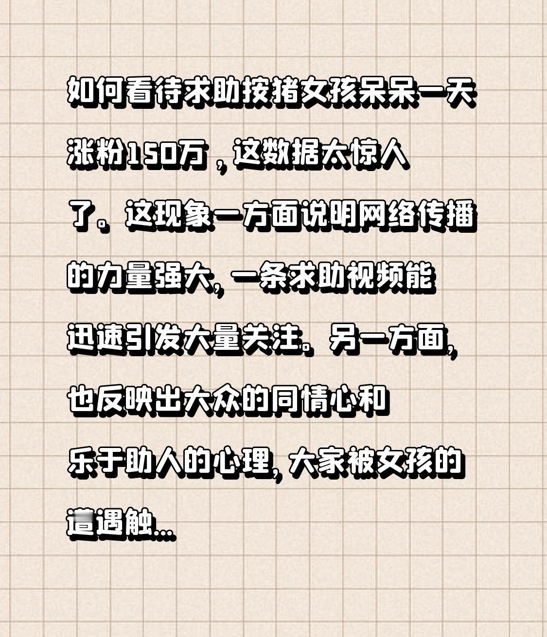 如何看待求助按猪女孩呆呆一天涨粉150万 求助按猪女孩呆呆一天涨粉150万,这数据太惊人了。这现象一方面说明网络传播的力量强大,一条求助视频能迅速引发大量关注。另一方面,也反映出大众的同情心和乐于助人的心理,大家被女孩的遭遇触动。不过,涨粉快也可能带来一些问题,比如后续内容能否维持热度。如果呆呆能好好利用这波流量,为大家带来有价值的内容,比如分享按猪经历、传递正能量等,粉丝量也能更稳定,否则可能就像一阵风,热度很快消散。