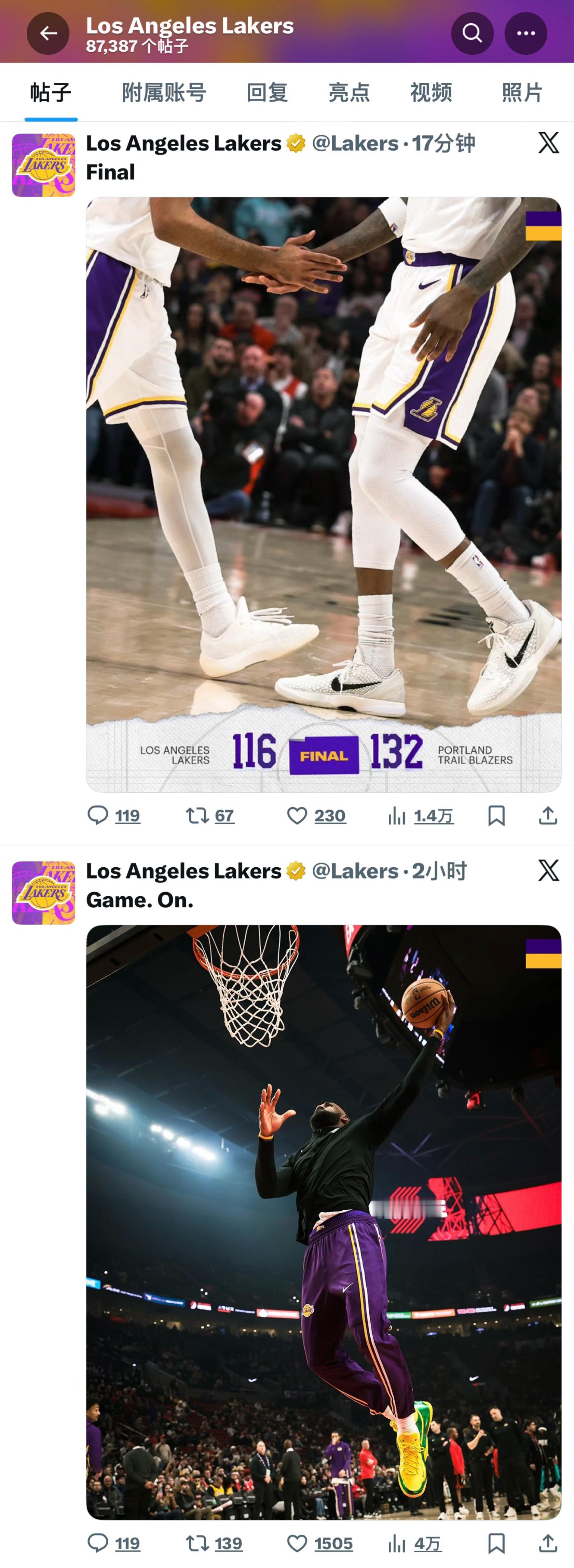 今天湖人官推就发了两条内容:比赛开始 和 比赛结束。