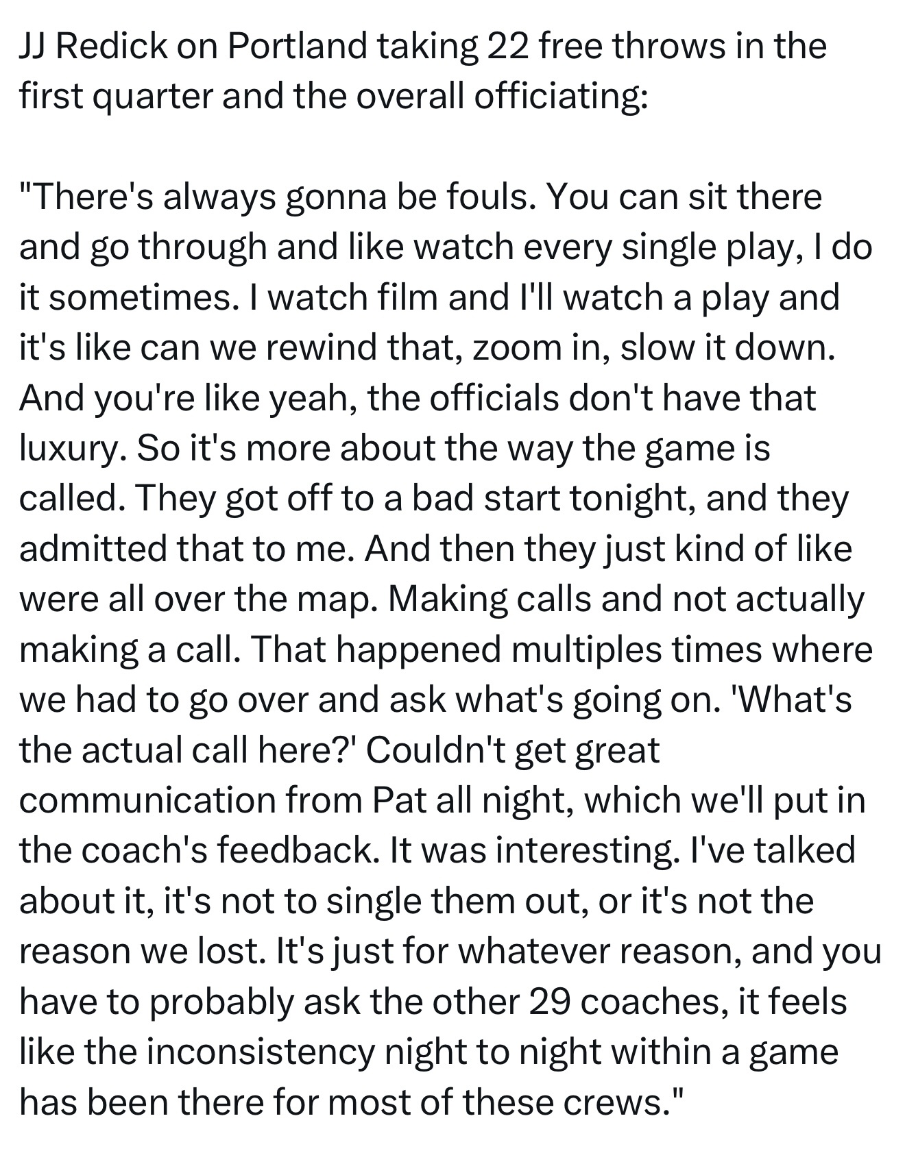 JJ·雷迪克谈到开拓者首节获得22次罚球及整体判罚情况时表示:“比赛中总会有犯规判罚。你可以坐下来逐个回合回看录像,我有时也会这样做——看比赛录像时我会反复回放某个镜头,放大慢放观察细节。但裁判没有这种条件。所以问题更多在于比赛的整体吹罚尺度。他们今晚开场确实吹得不好,这点他们也向我承认了。但后续的判罚就像失去了准星,时而响哨时而又对犯规视而不见。有多次我们都不得不走到技术台询问具体情况:'这球到底吹了什么犯规?'整晚和帕特(裁判)的沟通都很不顺畅,我们会把这点写进教练反馈报告。这现象很有意思——我之前就说过,不是要针对他们,更不是为输球找借口。但不知为何,或许你该问问其他29位教练,似乎大多数裁判组都存在这种'单场比赛尺度飘忽不定'的问题。”