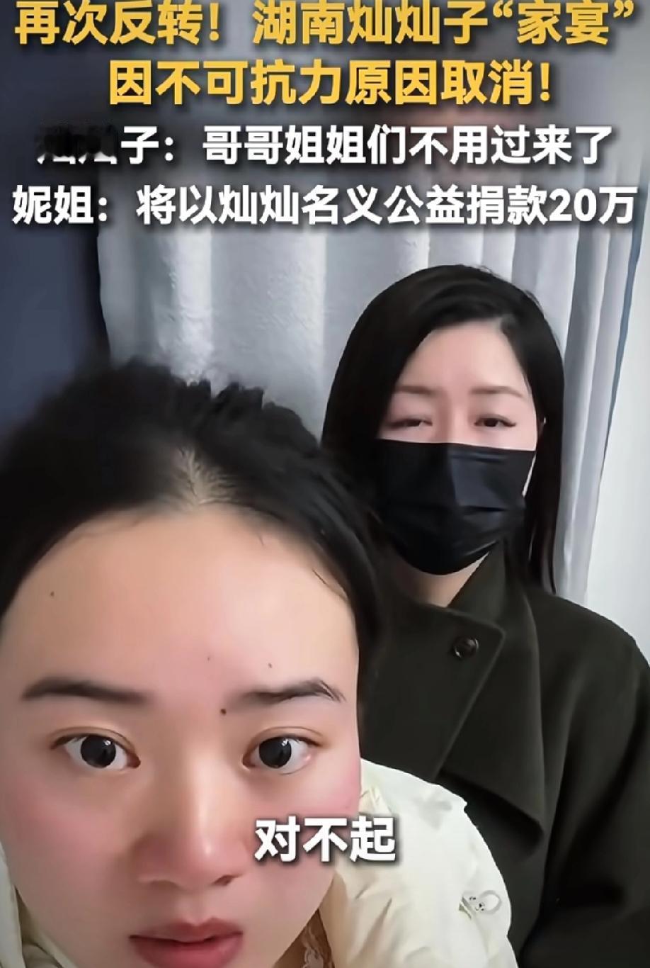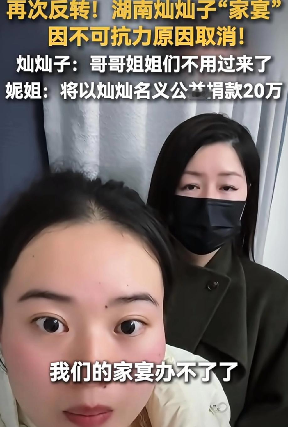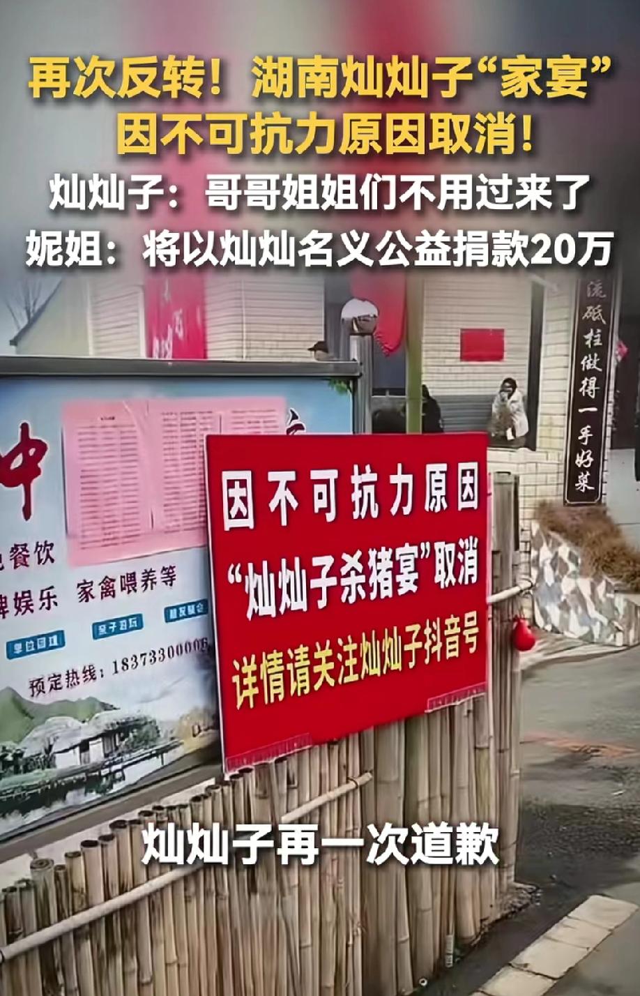 湖南株洲灿灿子“家宴”因不可抗力原因被再次取消! 灿灿子表示:哥哥姐姐们不用再过来了,我们本来什么东西都准备好了。 而另外一位网红大姐“妮姐”则表示:将以灿灿名义向株洲市慈善机构捐款20万元。 网友锐评:主要还是当时的口号太吓人了,要超过这个,超过那个,肯定会引起很多人的反感的,像她这种情况,应该现在全国各地办“杀猪宴”的都找不出第二家了。第一次被取消,第二次又被取消,这不是闹着玩吗? 评论区诸位网友,你们怎么看?