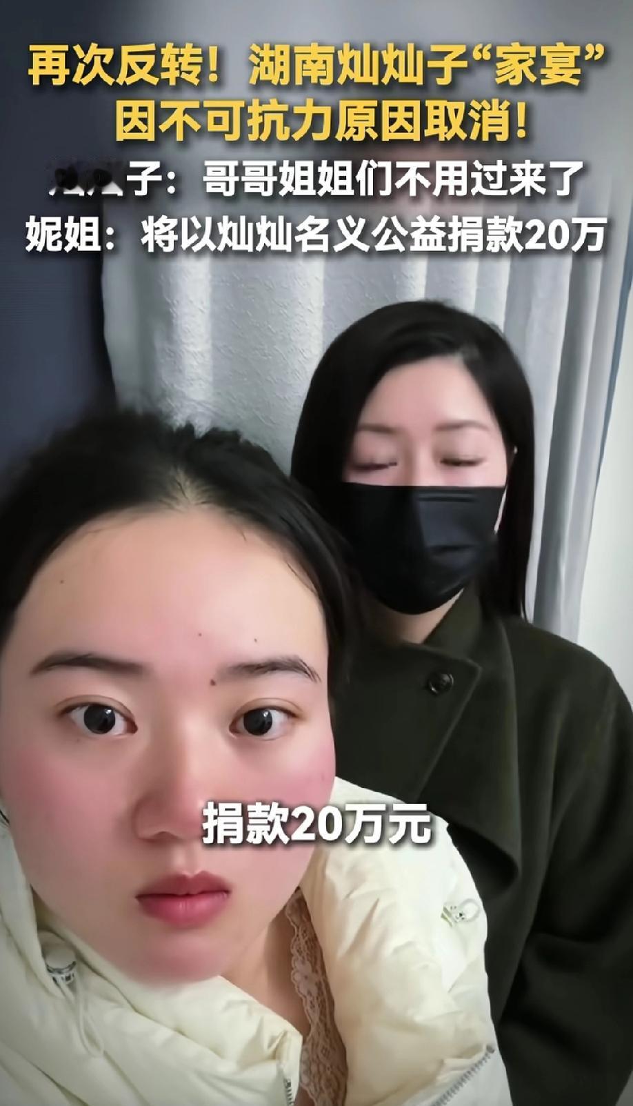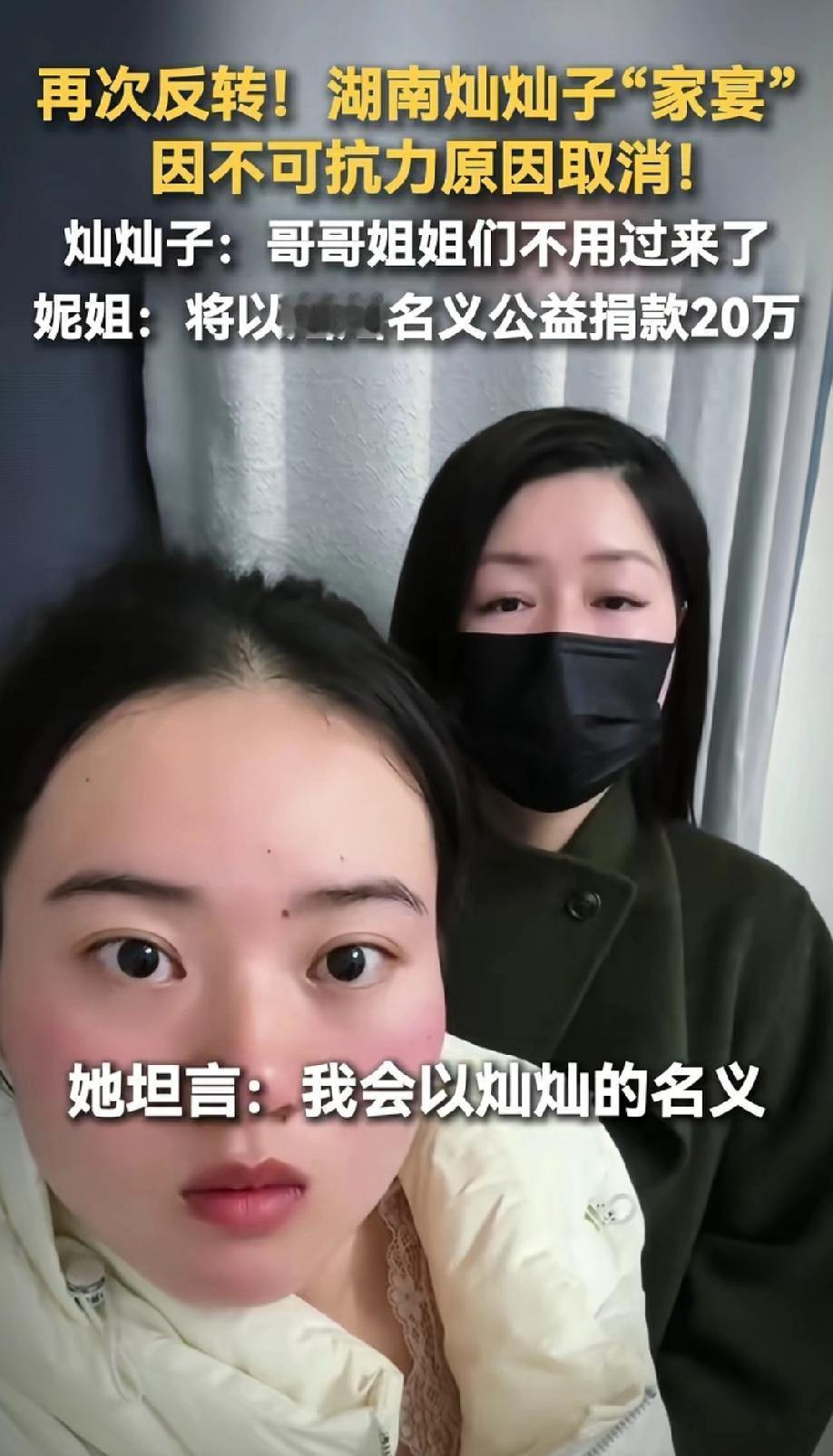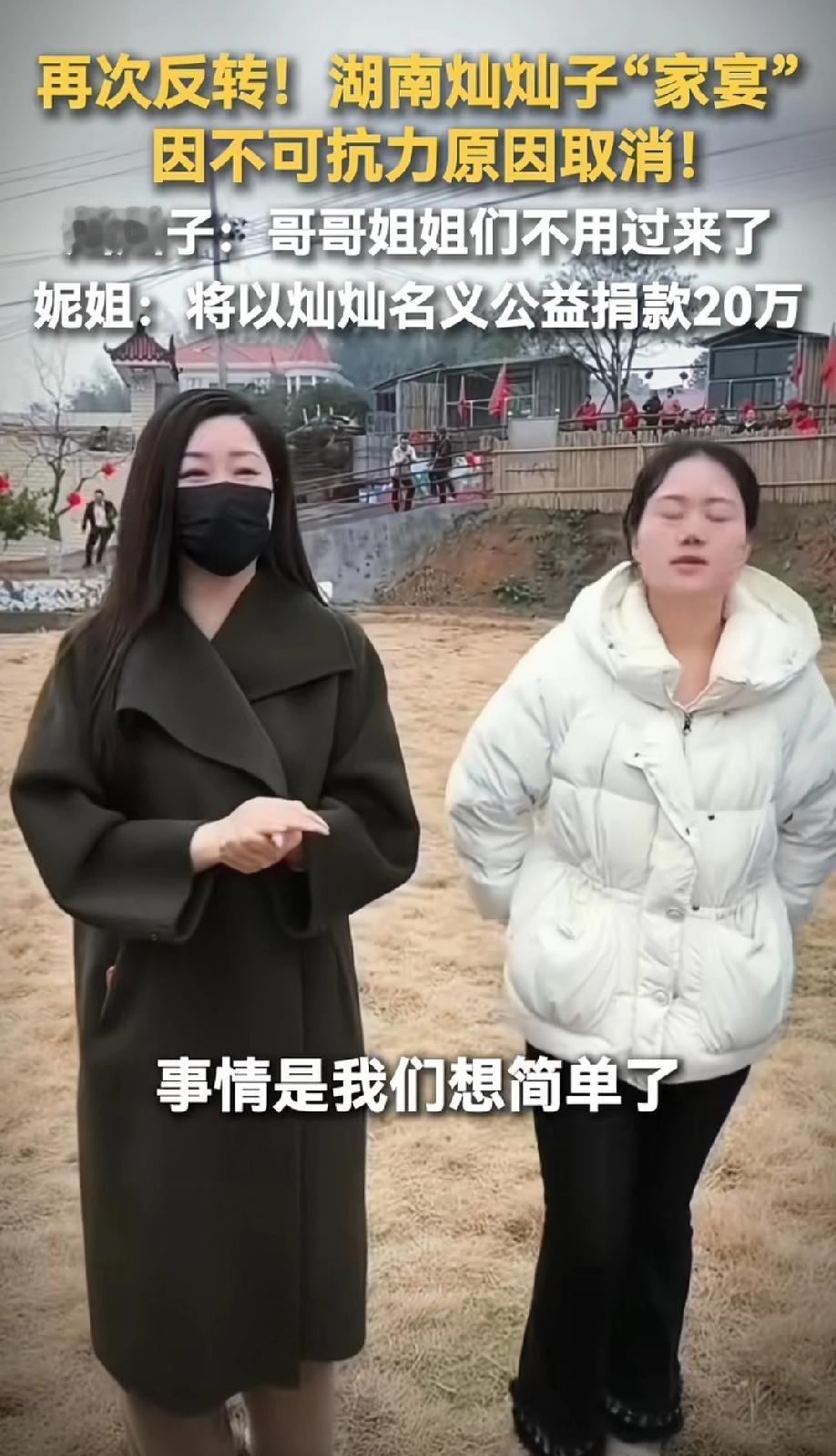湖南株洲灿灿子“家宴”因不可抗力原因被再次取消! 灿灿子表示:哥哥姐姐们不用再过来了,我们本来什么东西都准备好了。 而另外一位网红大姐“妮姐”则表示:将以灿灿名义向株洲市慈善机构捐款20万元。 网友锐评:主要还是当时的口号太吓人了,要超过这个,超过那个,肯定会引起很多人的反感的,像她这种情况,应该现在全国各地办“杀猪宴”的都找不出第二家了。第一次被取消,第二次又被取消,这不是闹着玩吗? 评论区诸位网友,你们怎么看?