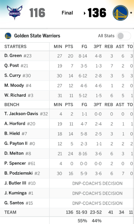 看看这个技术统计表,人人奋勇争先,8人得分上双,库里得分排不上号