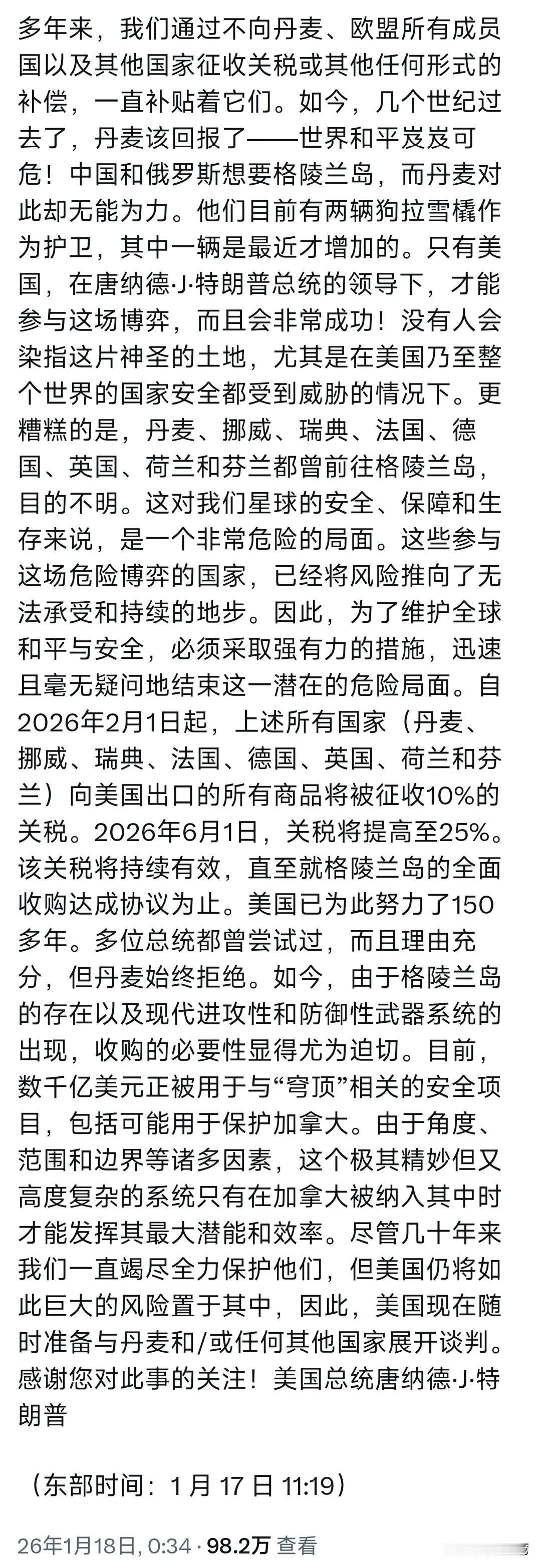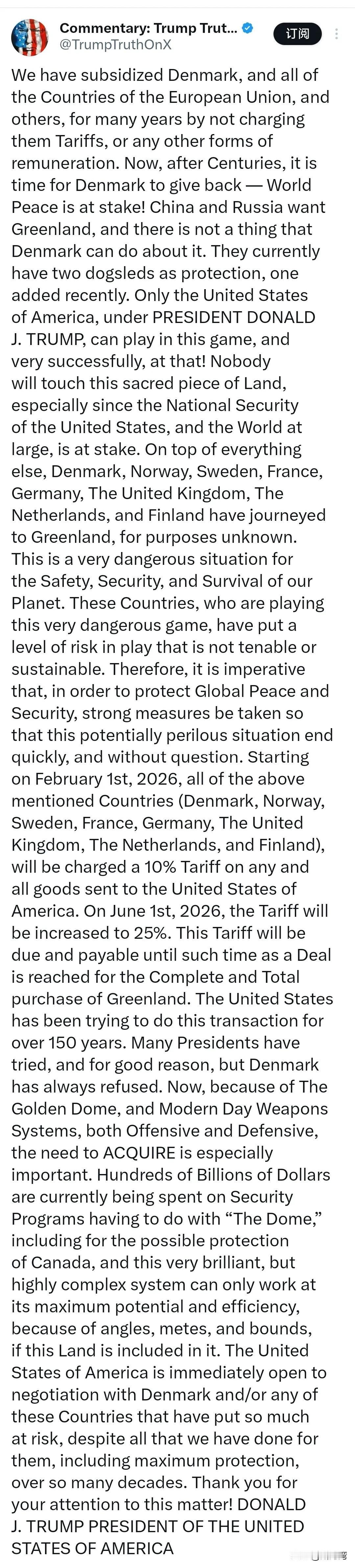 特朗普想要格陵兰岛,不仅拿出中俄做借口,更是拿出关税大棒进行威吓。 特朗普叫嚣不支持美国收购格陵兰岛的欧洲国家都得被美国用关税惩罚!