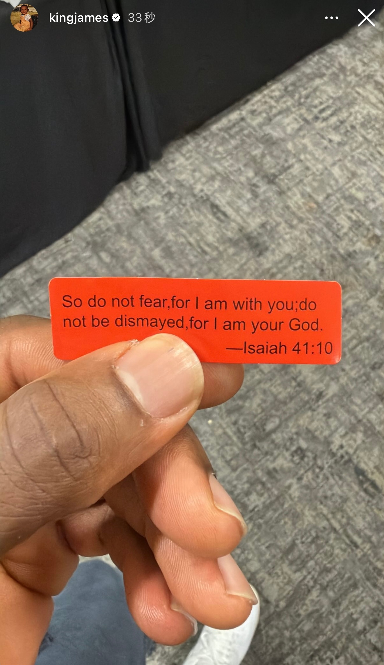 詹姆斯赛后更新动态,手拿一张小纸条,上面写着:“所以你不要害怕,因为我与你同在;不要惊惶,因为我是你的神。——《圣经·以赛亚书》第41章第10节。”