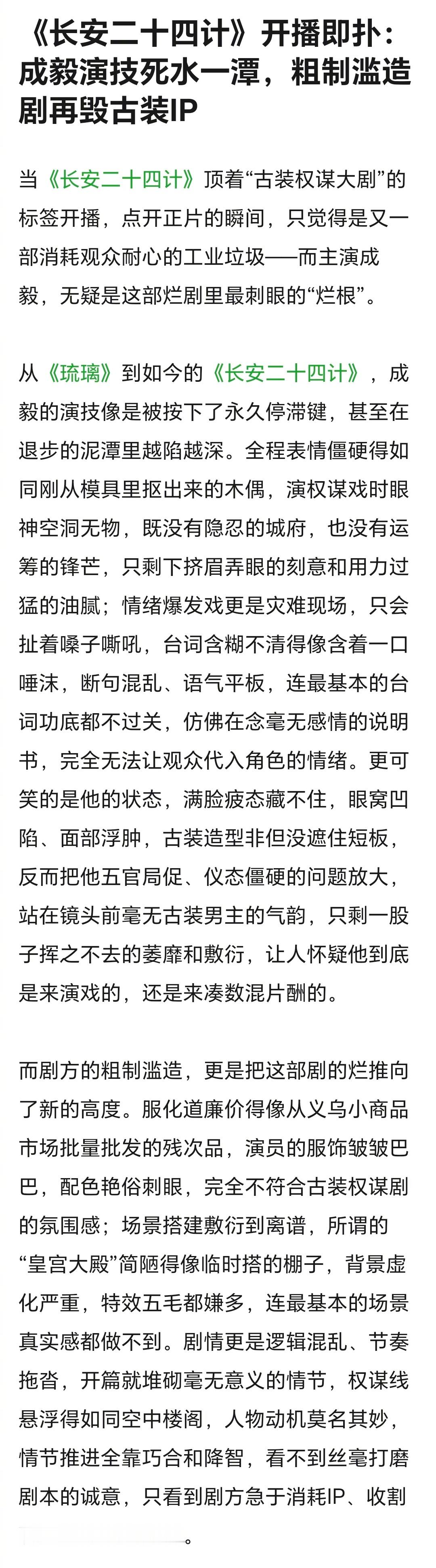 成毅长安二十四计优酷招商年冠 到底是谁在尬吹长安二十四计呀,这样一部很多人在喊难看的剧竟穿插了223个广告之多,观众看剧时感觉剧情拖沓的原因找到了,感情这是在预留广告位位呀!就这部剧而言,成毅的演技直到现在我都不认同,表情木讷,说话张不开嘴听不清楚,台词跟对着念一样…一群老戏骨和演技派配角都抬不起来一个成毅。不过好在成毅有一群好 粉 丝 ,闭着眼去给五星好评,当时DB清理了3万多条异常好评的事还历历在目,从这个维度讲,成毅也是圈内第一人。图源:网络成毅长安二十四计优酷招商年冠
