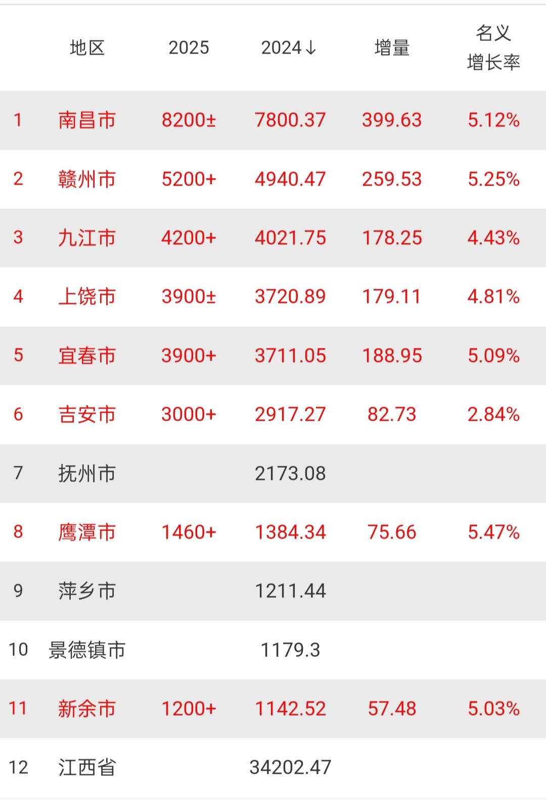 江西8个城市2025年官方GDP预计值出炉:南昌8200亿、九江4200亿、吉安3000亿 江西是我国中部六省之一,2025年江西省GDP预计实现3.6万亿左右,位居中部第5名;截止目前,江西已有8个城市2025年官方预计GDP值出炉,其中南昌GDP总量全省最高,预计实现8200亿。 赣州和九江GDP差距扩大至1000亿,2025年GDP预计实现5200亿和4200亿,位居全省第2-3名。 吉安2025年GDP总量成功突破3000亿,较2024年增加了82.73亿,成为全省第5个经济总量破三千亿的城市。 四小市中的鹰潭和新余2025年GDP官方预计数值分别实现1460亿和1200亿,曾经经济总量相当的鹰潭和新余,如今差距已经扩大至260亿。