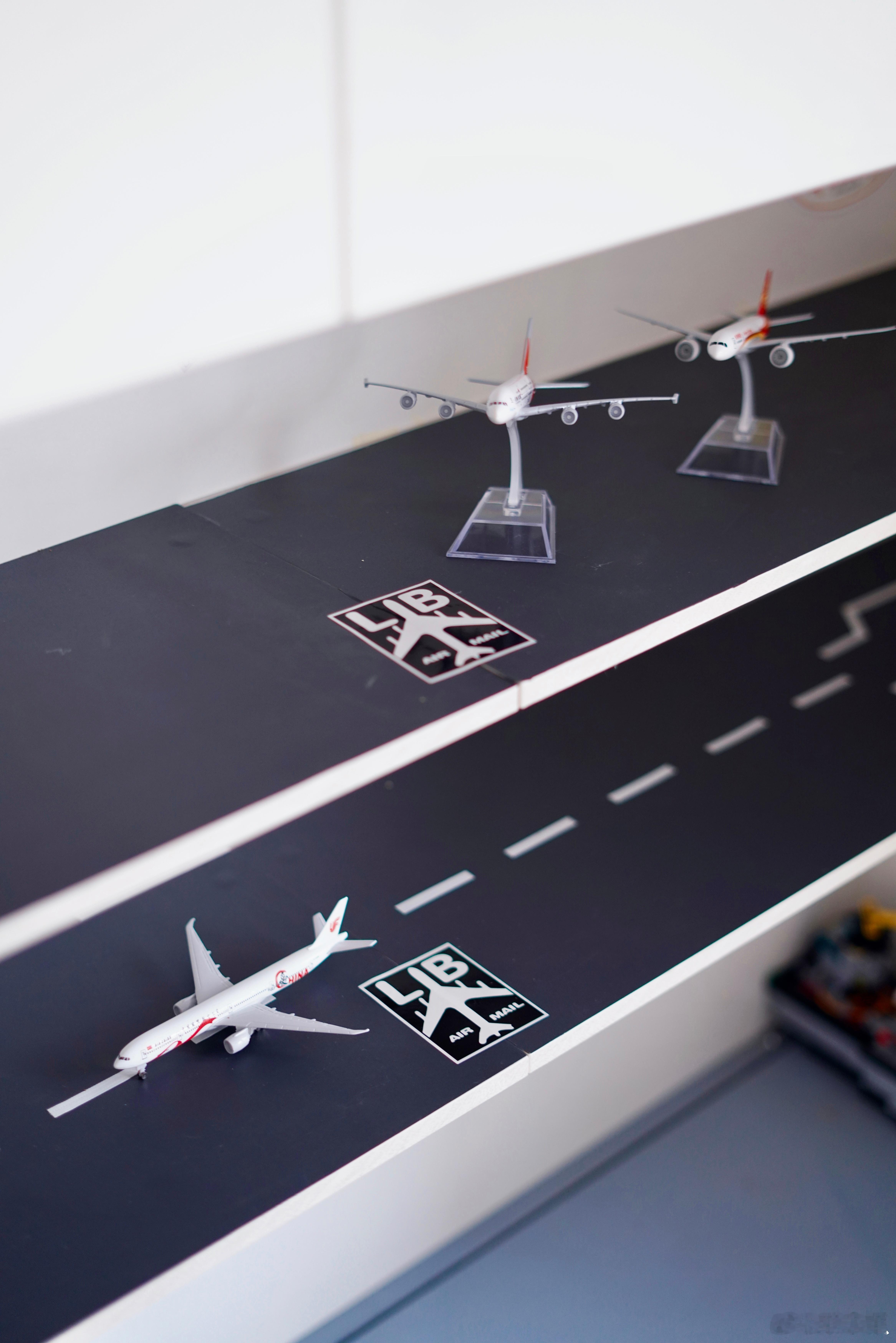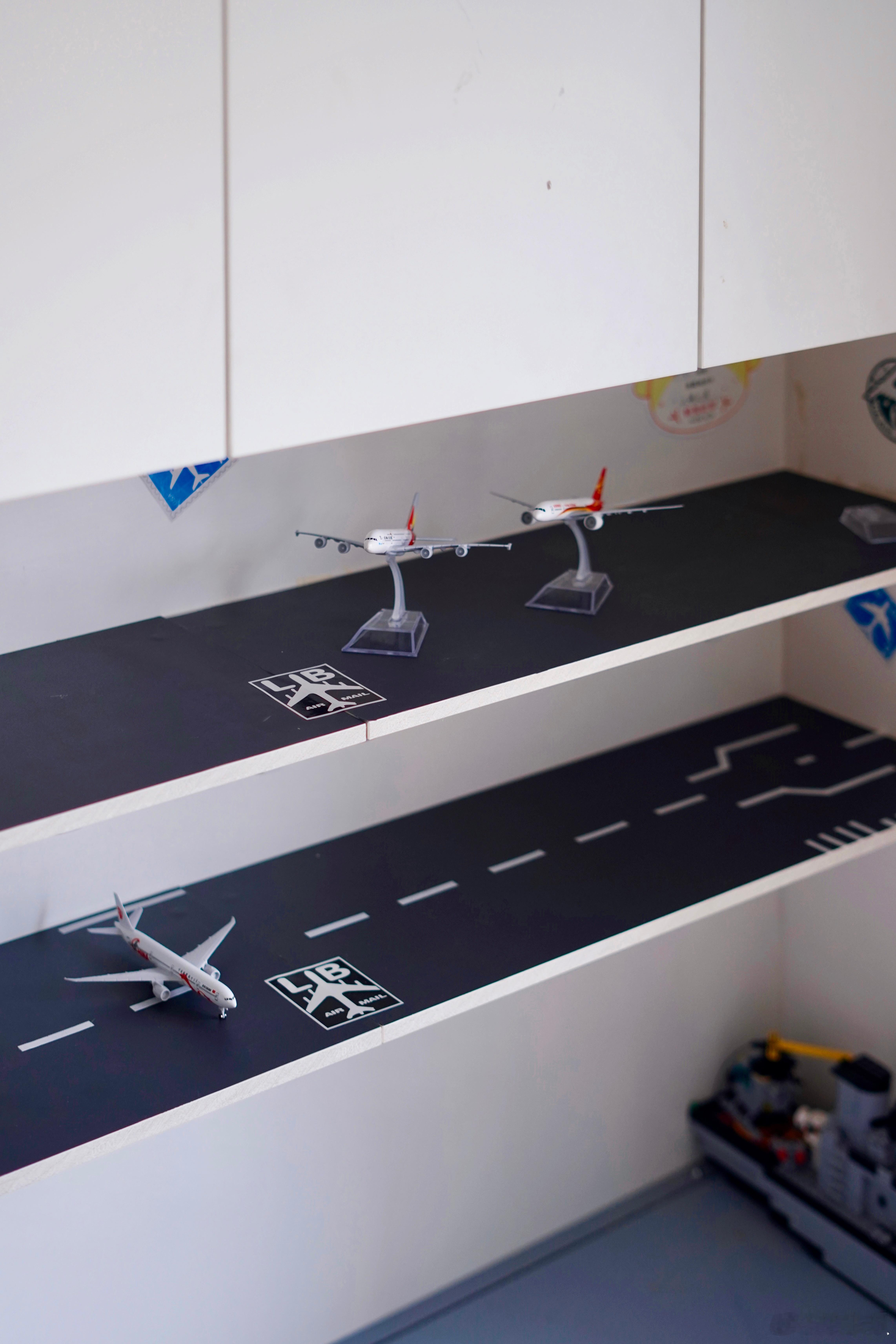 Steven 最近迷上了飞机,我干脆跟他立了个约定——只要考试能上95分,就给他兑现一架飞机模型。这个周末,Chris 动手用木板钉了两排架子,贴上灰色贴纸,画出飞机跑道的模样。把这两排“迷你机场跑道”固定在Steven床头。今晚等他从爸爸家回来,瞧见这点小改造,估计会很开心。