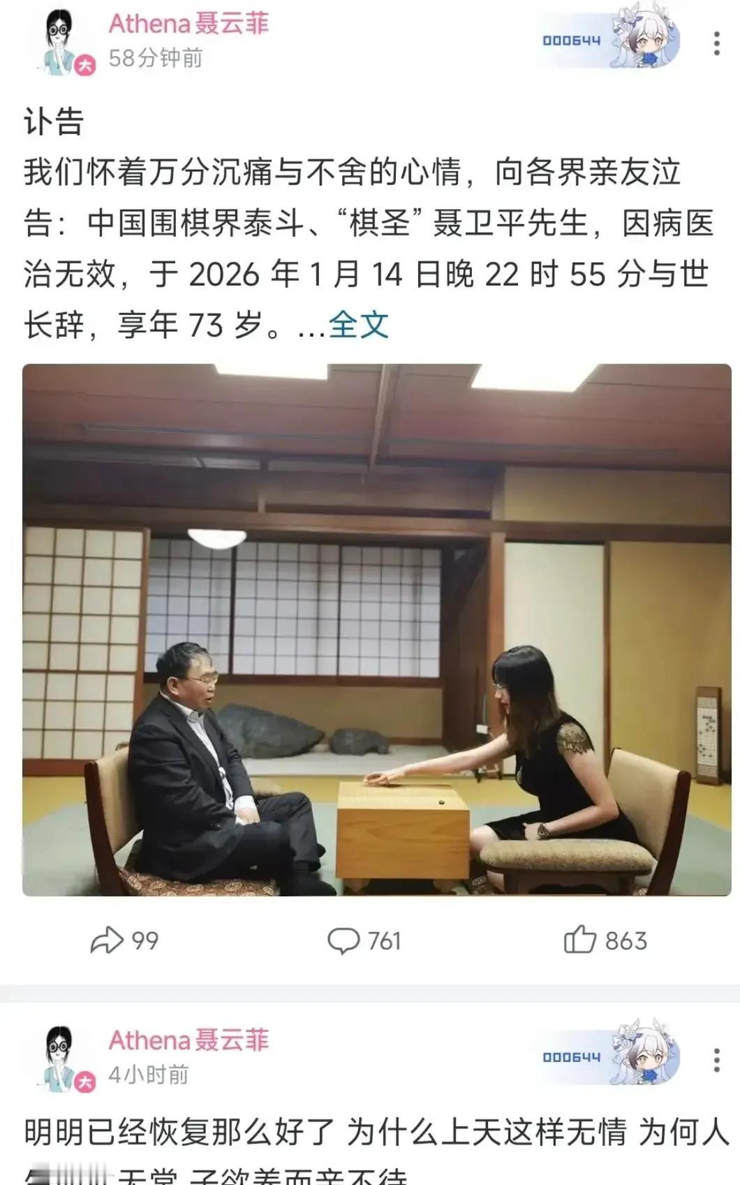22岁的聂云菲,应该是聂卫平最宠爱的孩子了,看得出来,也是在聂老的追悼会上最难过的一个孩子。 眼睛哭肿了不说,就连走路都因为过度悲伤,而步履踉跄,看得人直担心,生怕她哪步不小心踩空摔倒。 别看聂云菲年龄小,却很知礼节识大体,尽管内心悲痛欲绝,但是面对礼堂外面前来吊唁的亲友和父亲的粉丝们,还是鞠躬表示谢意。 聂云菲是聂卫平的第三个孩子,是他与小二十几岁的三婚妻子兰莉娅的女儿。 此前,聂卫平曾经有过两段婚姻,两任妻子也都是说一不二的女强人。 也许正是因为这一点,才让聂卫平经常与她们陷入到争吵当中。 第一任妻子孔祥明,同样为顶尖棋手,两人对弈复盘时,经常争得鼻子不是鼻子,眼睛不是眼睛,通过这一点就能看出两人个性都很强。 孔祥明对于花样滑冰还有音乐会极其热衷,然而,有一回两人共同去看演出时,聂卫平居然中途睡着了,甚至因为距离扩音设备近,打呼噜的声音,也传了出去。 这让坐在他身边的孔祥明尴尬不已。 后来,随着儿子聂云骢的出生,以及聂卫平成名后各种事务的增多,孔祥明便选择淡出,回归家庭相夫教子。 在这一时期,聂卫平开始沉迷于打桥牌,有时候一打打到深夜,加之还有女性牌友参与,这让孔祥明无法接受,也成为两人屡次争吵的导火索。 如果仅仅因为个性不合,也许两人还能凑合着过下去,但是,因为后来聂卫平认识了王静,而导致他主动提出离婚。 1991年,孔祥明与聂卫平办理离婚手续,随后带着儿子聂云骢去了日本,不仅加入该国国籍,还把儿子的名字,也改成了孔令文。 2003年,孔令文结婚,聂卫平特意送上礼金,但是却被退了回来。 聂卫平提出让儿子改回聂姓的要求,也遭到拒绝。 好在后来孔令文选择了与父亲和解,还在聂卫平缠绵病榻之际,与自己的弟弟妹妹交替照顾父亲,对于聂卫平来说,也算有生之年没留遗憾。 不过,孔祥明与聂卫平之间的死结,却一直没有解开,同样与聂卫平争吵不断的王静,应该也没有跟他和解,在18日的追悼会上,两任前妻不仅没有现身,甚至连花圈都没有送。 然而,聂卫平的三婚妻子兰莉娅,却跟他琴瑟和谐,相敬如宾,一方面得益于她的温婉个性,另一方面,也有前两段婚姻带给聂卫平的经验教训使然,让他知道通过看到婚姻和伴侣的可贵之处,而对感情和两人的相处缘分倍加珍惜。 在和谐氛围当中出生长大的女儿聂云菲,对父亲的感情,与两个哥哥相比,肯定是不一样的。