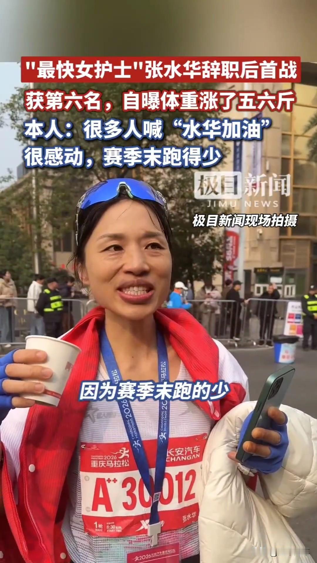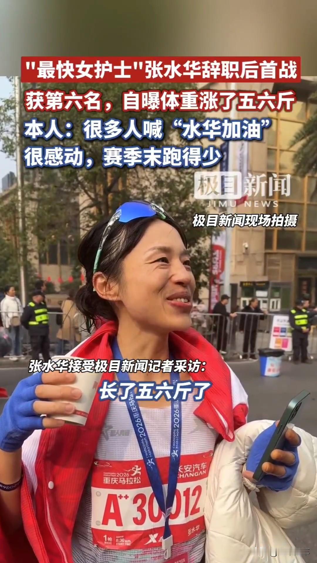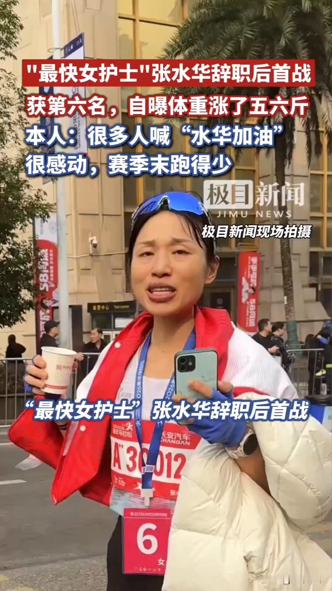 护士张水华辞职后以2小时30分48秒完成重庆马拉松首秀。 女子组冠军是埃塞俄比亚选手科贝布什·伊斯玛泽伍·奥尔德马利安姆,成绩为2小时24分48秒。张水华,成绩为 2 小时 30 分 48 秒,获得国际女子组第六名和第一名的成绩相差整整六分钟。 网友们乐见张水华辞职,是承认她的运动能耐,从业余跑马变成全职跑马,不用受到医院职责的牵制。统计指出张水华,前段时间靠参加马拉松赛事拿到了20万元左右的奖金。但她今后想要靠赛事奖金维持生计非常困难(本次国内第四名实获2万元)。25年很多顶尖职业选手为备战全运会,放弃了很多高奖金赛事,随着这些职业选手回归商业赛事,竞争会非常激烈,张水华想要复刻去年的辉煌战绩,十分困难。不过张水华非一般的跑马选手,她可以通过代言以及直播带货来获得更多的收入,这就需要她的团队保持住热度才有流量。 我以前说的她辞职是给大伙一个体面的交代,张水华辞职不只是放自己一马,也为医院领导、科室同事、体育品牌商、马拉松组委会等“松绑”了,一人辞职,多人轻松。张水华夫妇 张水华跑马