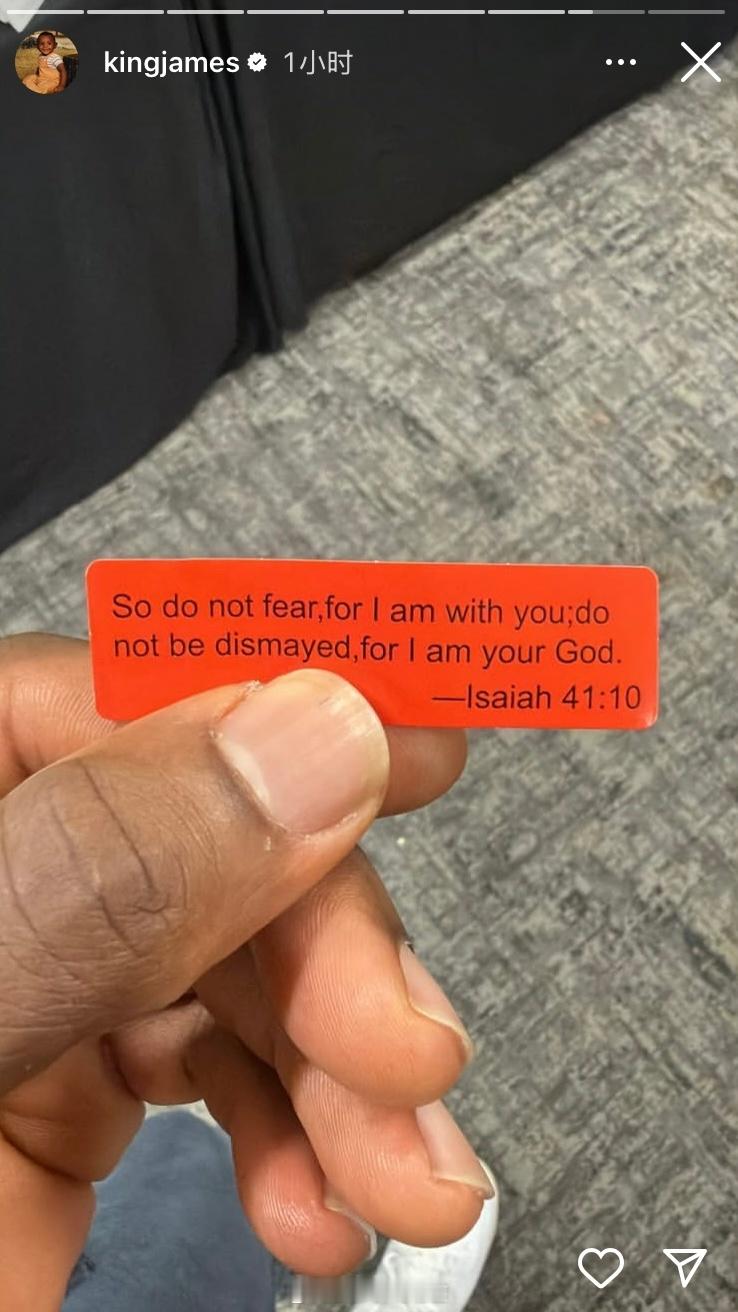 勒布朗-詹姆斯赛后更新IG限动,分享这张纸条的内容“你不要害怕,因为我与你同在;