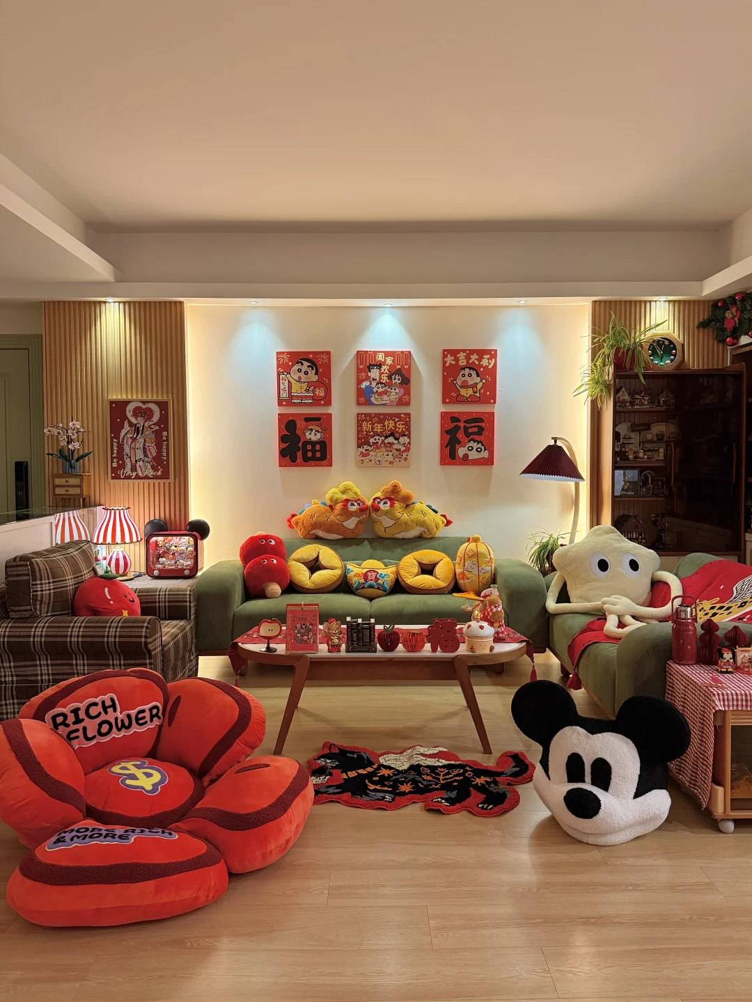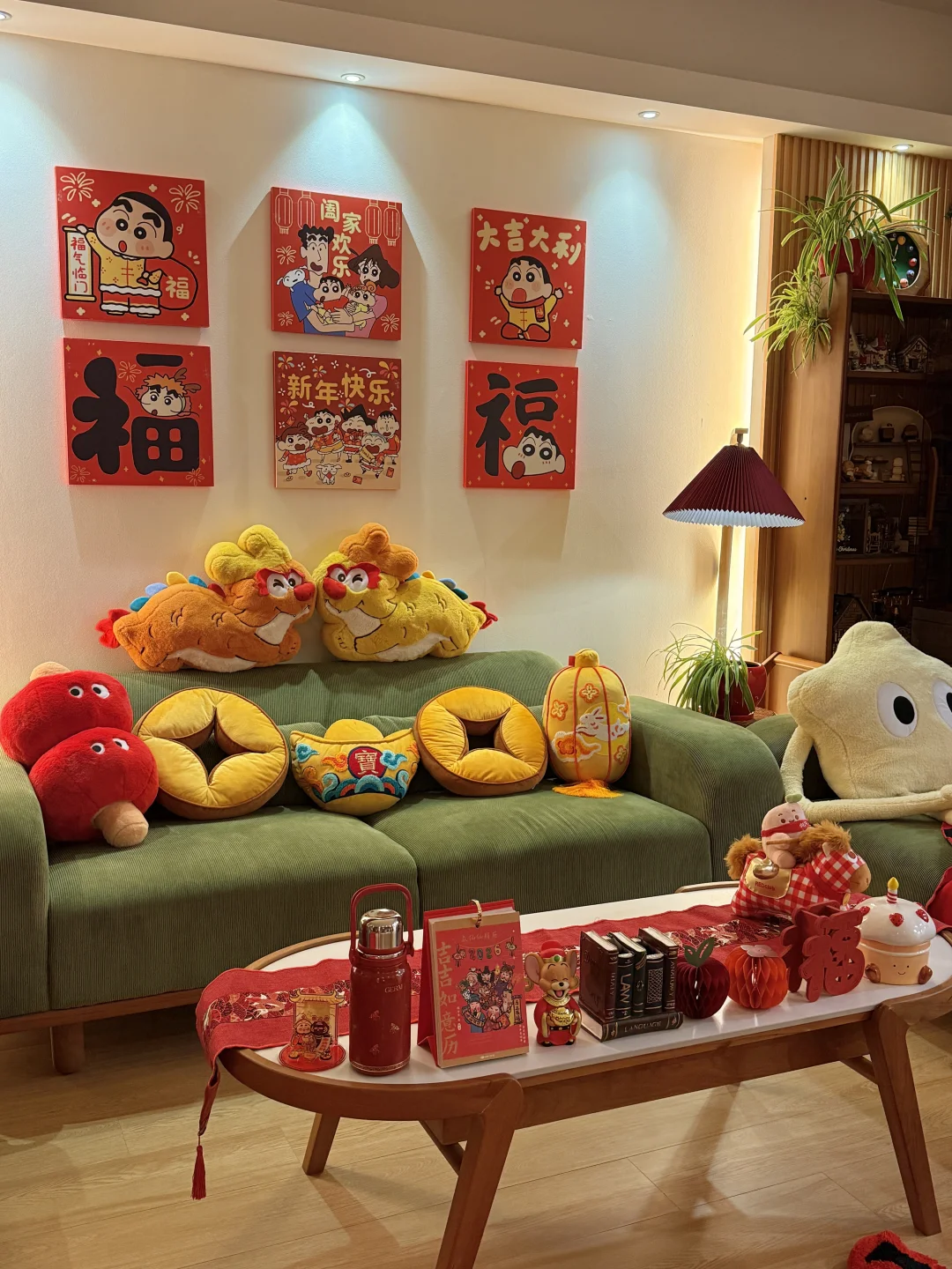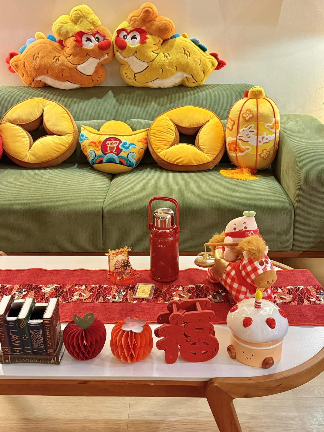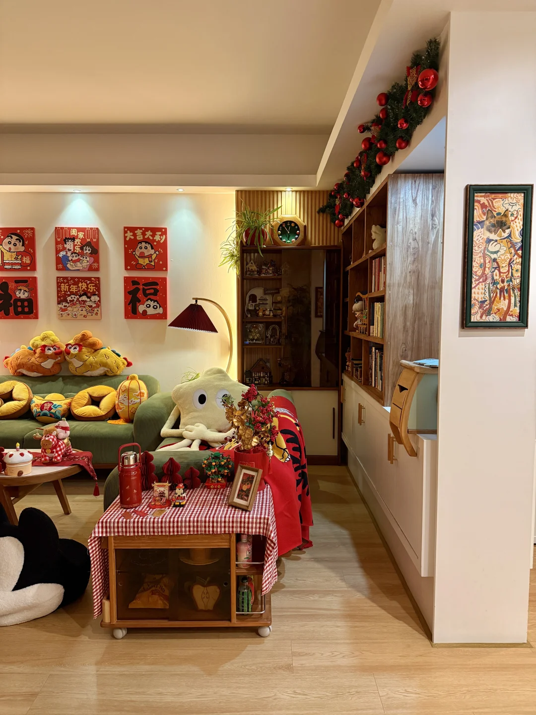 2026新年氛围感客厅布置上线啦🧧 圣诞树挂满红灯笼,年味招财装饰齐登场🐾 沙发被可可爱爱的国风抱枕包围! 90后幼稚鬼的家就是要可可爱爱~
