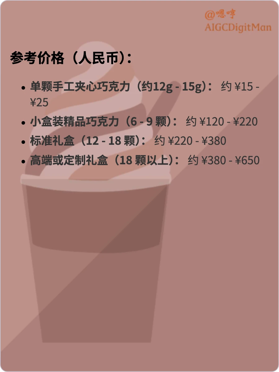 单颗手工夹心巧克力(约12g - 15g): 约 ¥15 - ¥25