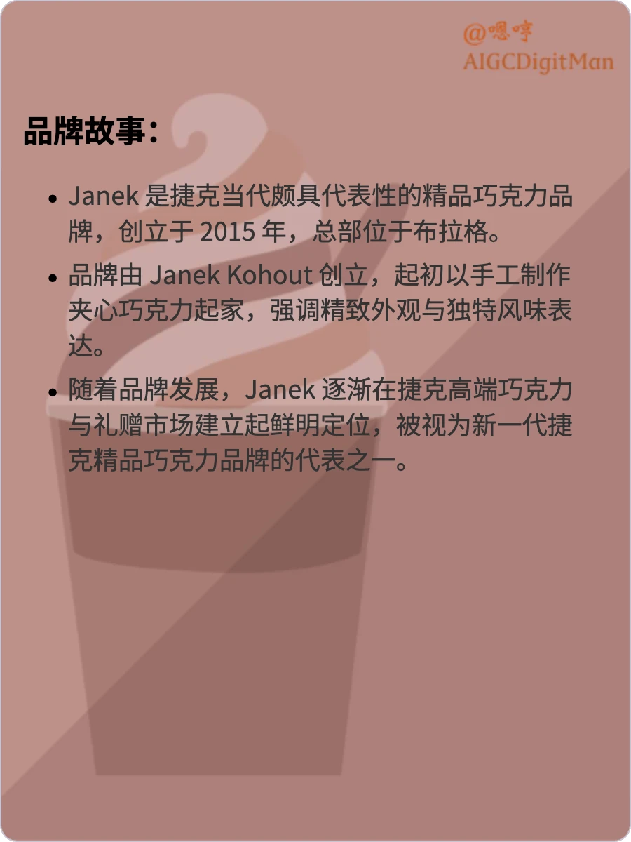 随着品牌发展,Janek 逐渐在捷克高端巧克力与礼赠市场建立起鲜明定位,被视为新一代捷克精品巧克力品牌的代表之一。