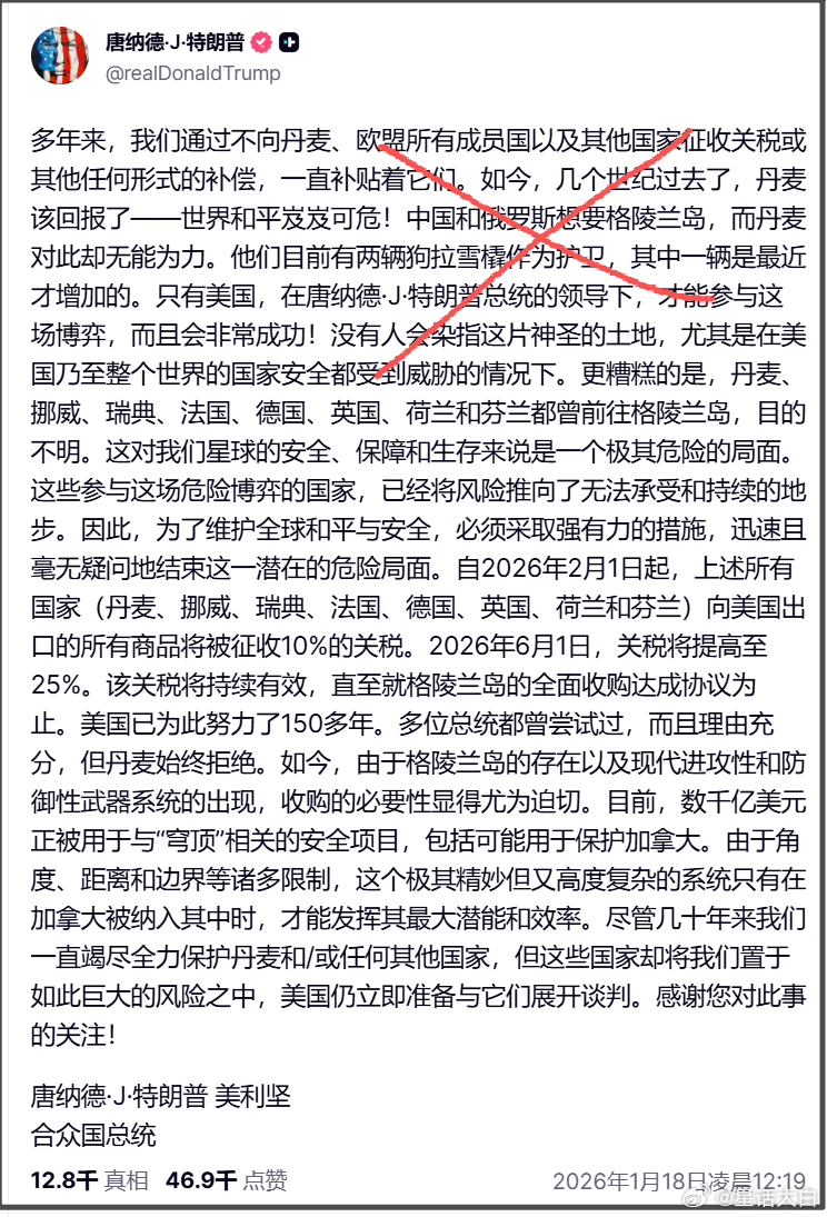 特朗普的不要脸程度,总是能一次又一次刷新我对他的认知。特朗普宣布对欧洲八国加关税的帖子里,除了明目张胆说要“全面收购”格陵兰岛之外,还贼喊捉贼说:“世界和平岌岌可危!中国和俄罗斯想要格陵兰岛,而丹麦对此却无能为力,他们目前有两辆狗拉雪橇作为护卫,其中一辆是最近才增加的。只有美国,在唐纳德·J·特朗普总统的领导下,才能参与这场博弈,而且会非常成功!”明明是特朗普自己在吞并格陵兰岛,愣是贼喊捉贼。虽然这是特朗普一贯套路,但他能把这么无耻的言论,不加掩饰的公然发表出来,还洋洋自得,说特朗普无耻,感觉都是夸他了。特朗普昨天还发了个黑白个人照,自封“税王”#荷兰称欧洲必须同美国划清界限# #特朗普称世界和平岌岌可危#